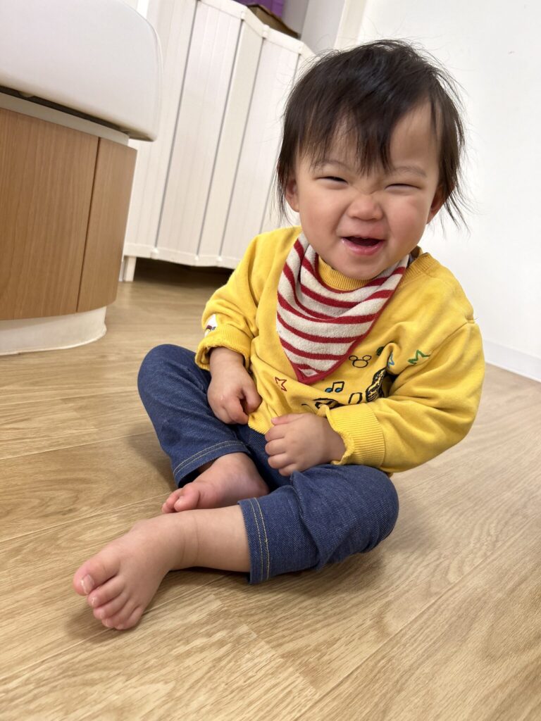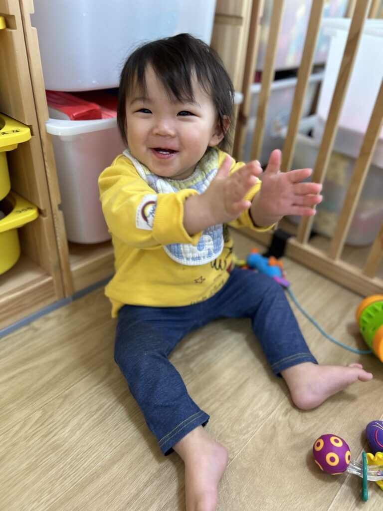 保育者が手を叩くと笑顔で拍手をしたり、ふと見ると立って、歩いて保育室にあるおもちゃ箱に何が入っているのか覗いたり、そして出し、おもちゃの箱がからっぽ🤹♂️周りにはたくさんのおもちゃ(笑)