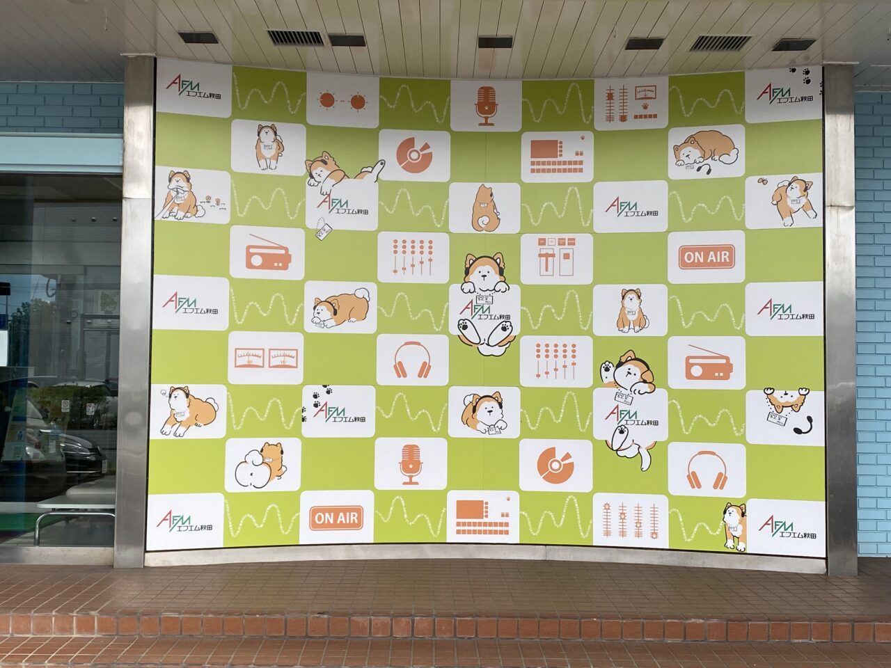 到着して、入口へ向かうと秋田犬とラジオで使うヘッドフォンを組み合わせた