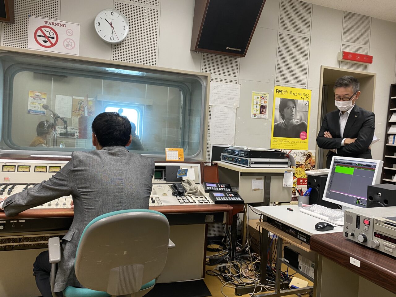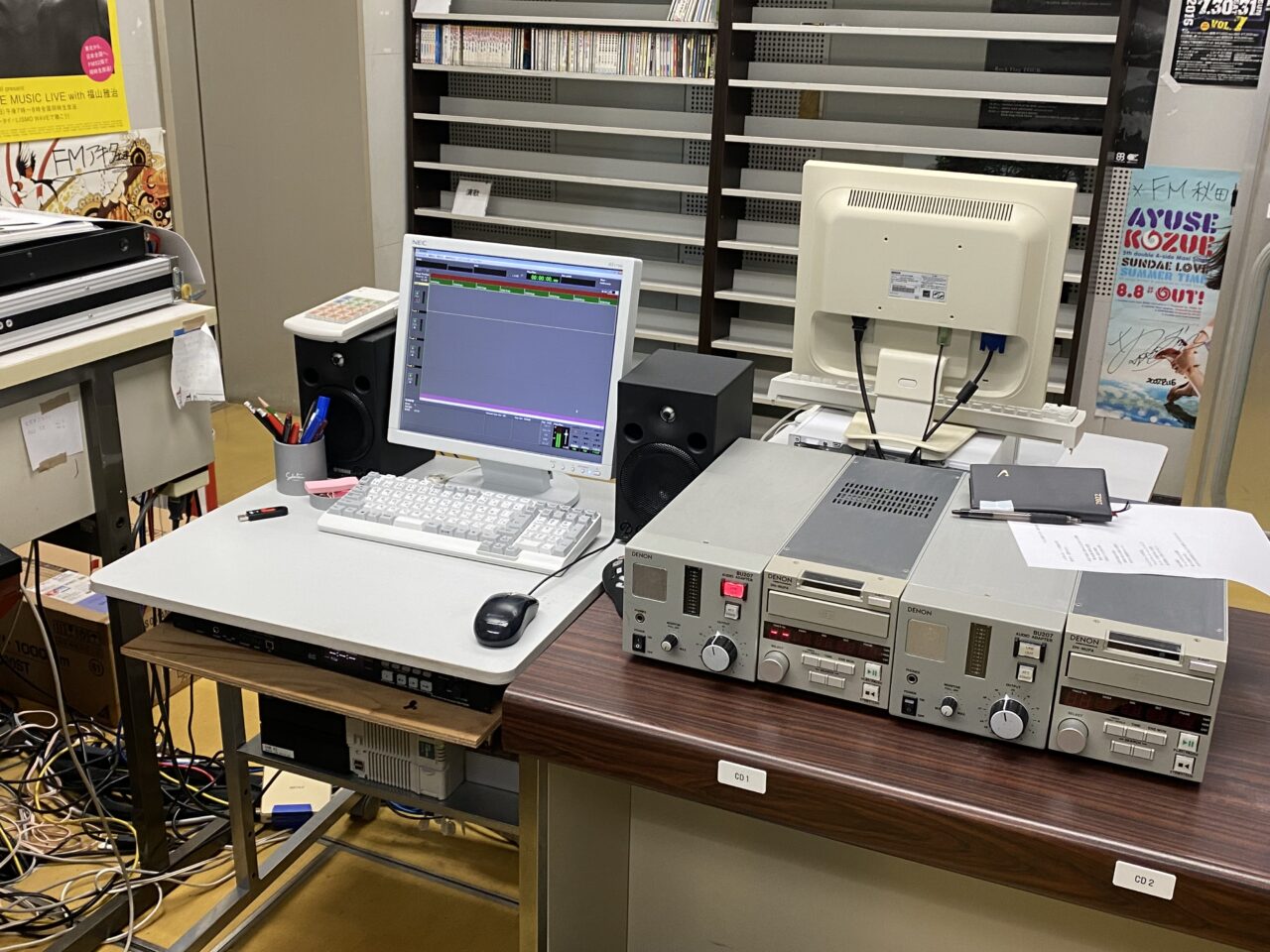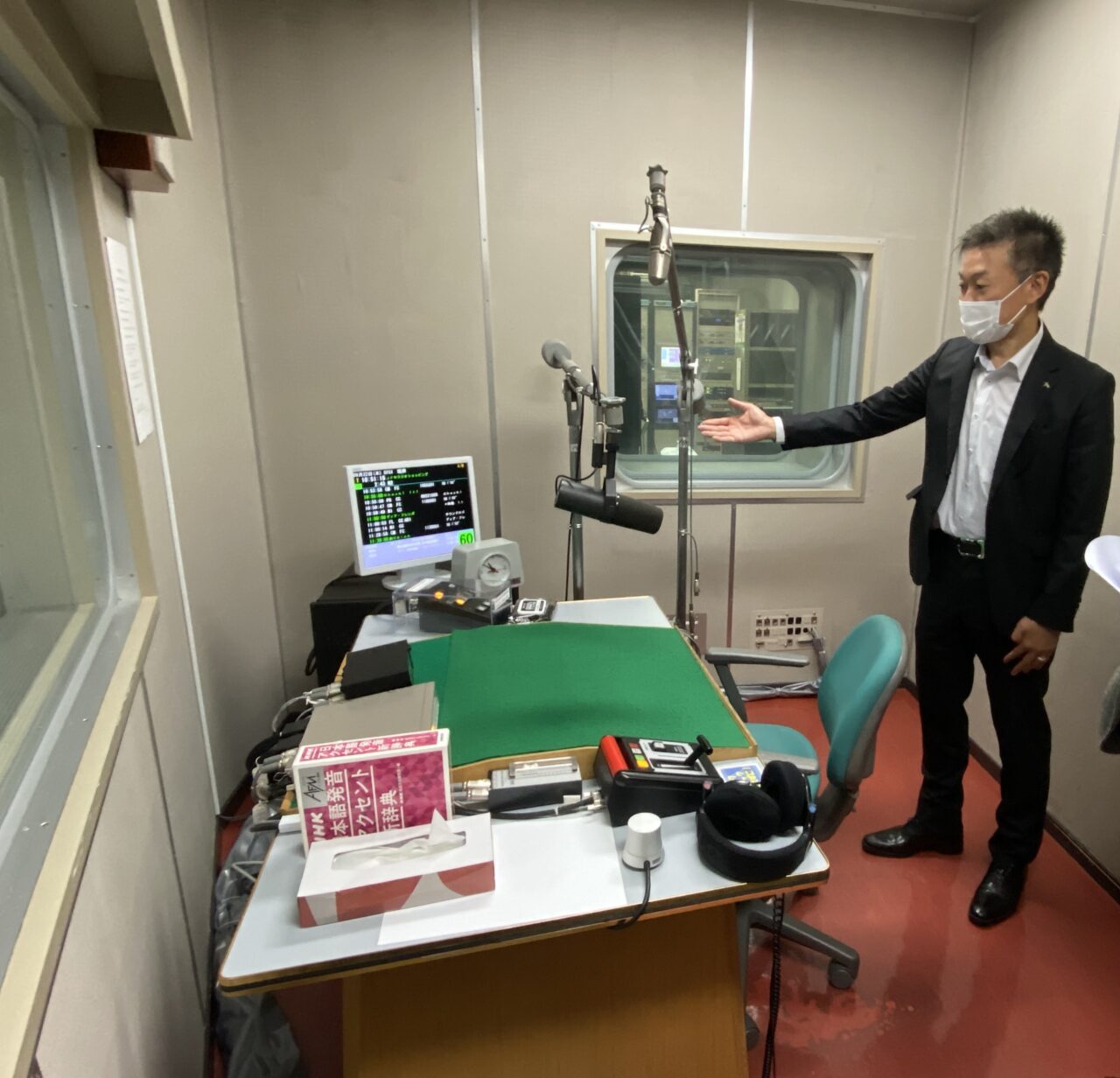 収録場所は会社の2階にあり、中には音量調節の機械、収録した内容の長さが確認できたり、BGMをかけたりする機械などが設置されていました?️