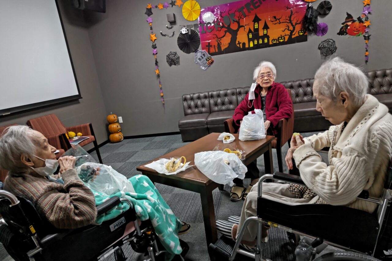 ラウンジでは、もぎとった果物を早速楽しむCさんKさんIさん?