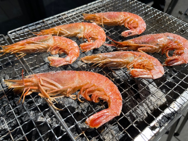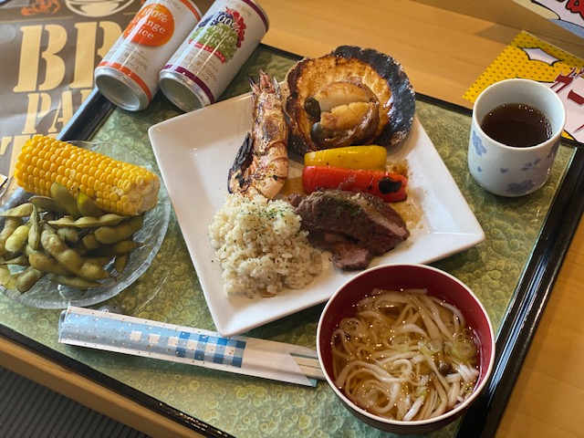 一生懸命焼いてくださったエビ・ホタテをプレートに乗せ豪華BBQランチの完成?