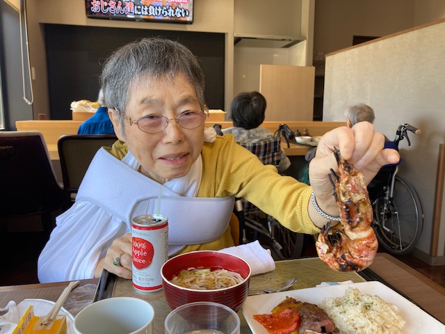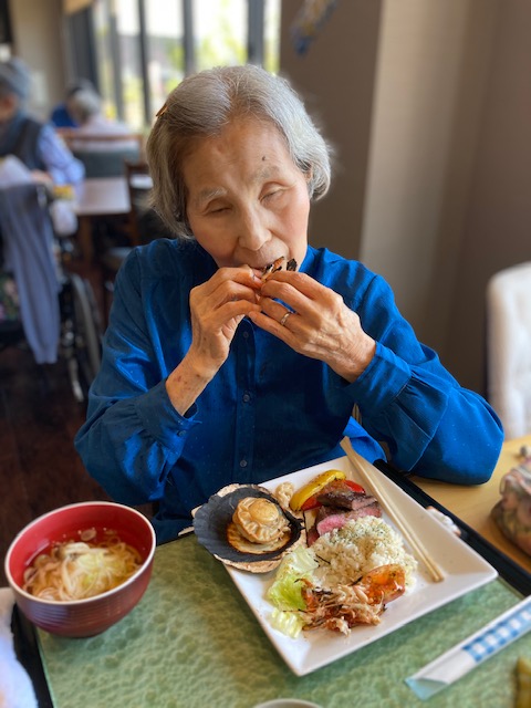 利用者さんは久しぶりのホタテ・エビ?に「うわーすごい!でかくて美味しそう」と笑顔になられていました。