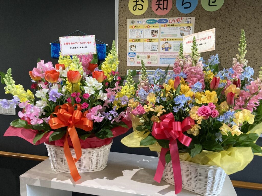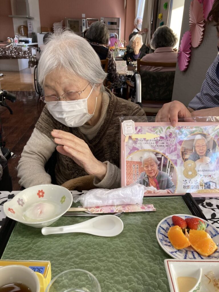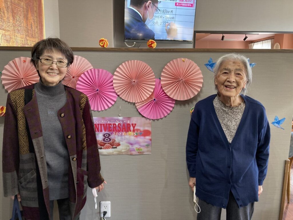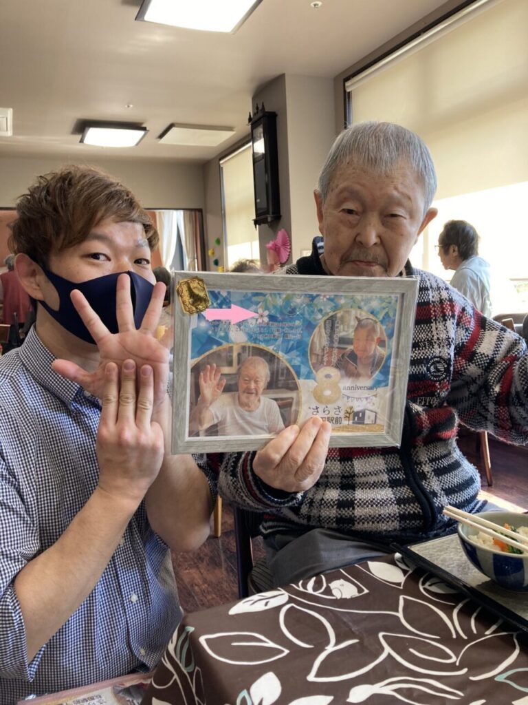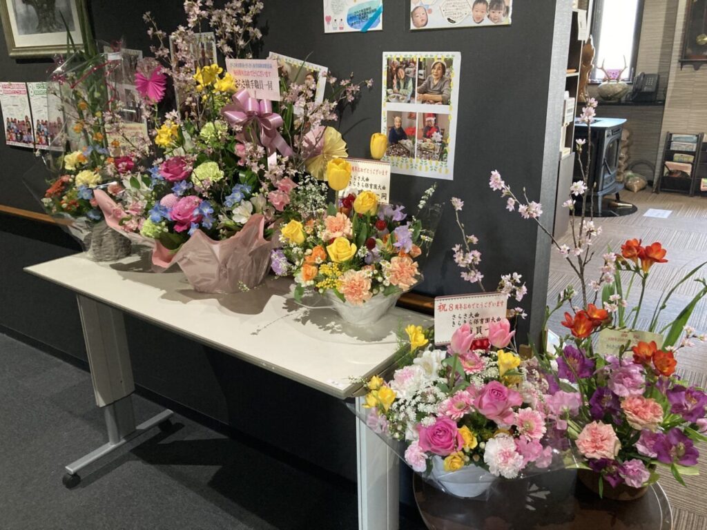 「私も8周年!」と開設当時からいらっしゃるKさん。「8年もよく頑張ったね。」と労ってくださるSさん。ご利用者の皆さんあってこその私達です!感謝の気持ちを込めて、みんなでお祝いを??