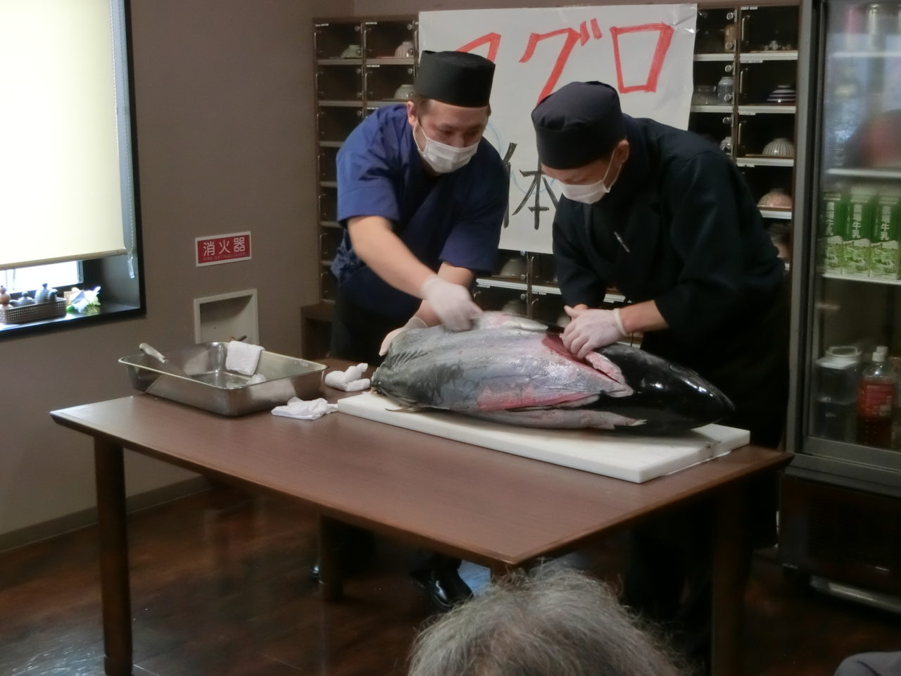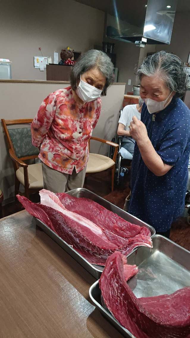 一冨士さんのご協力をいただき、マグロの解体ショーをご覧いただこうと、ご利用者の皆さんへさっそくお知らせし、レストランへ集合♬