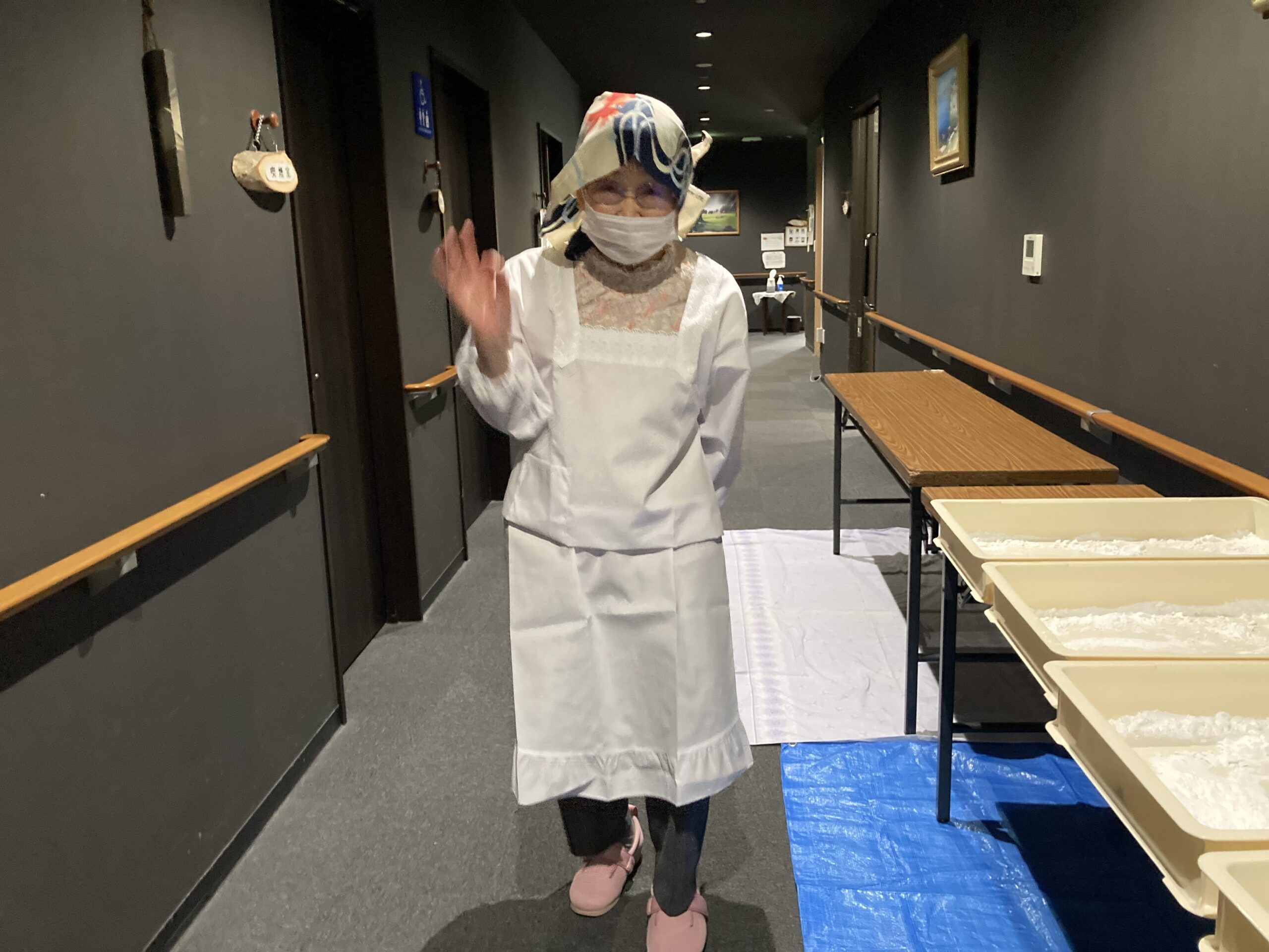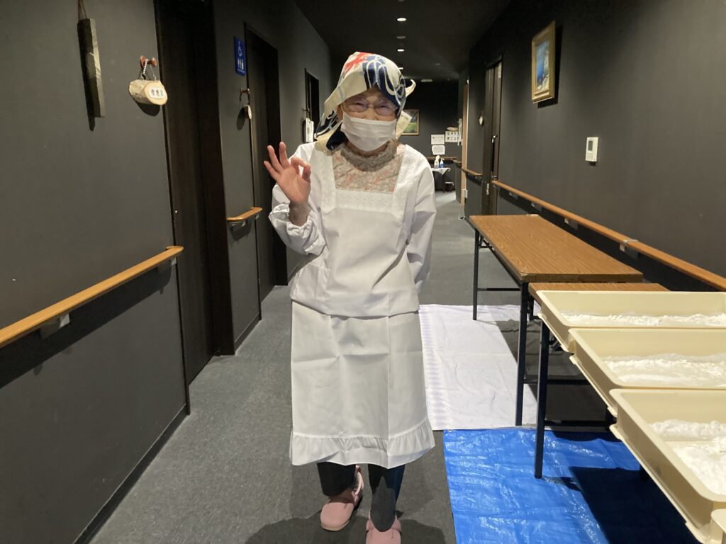 準備が整い、いよいよ始まりです✨昨年に引き続きOさんが「あいどり」を買って出て下さいました!(^^)! 自前の割烹着がよくお似合いです?