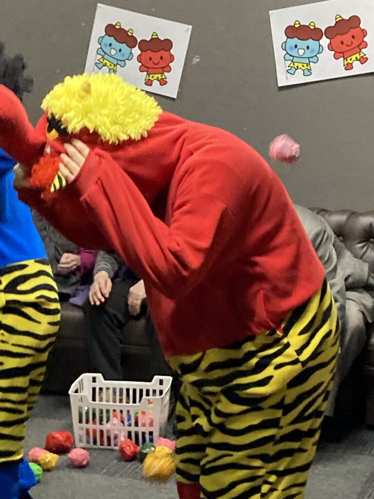 赤鬼・青鬼?登場の前に、両手に球を持ち、どうやって退治するか念入りに打ち合わせを行うOさんとIさんです( *´艸`)