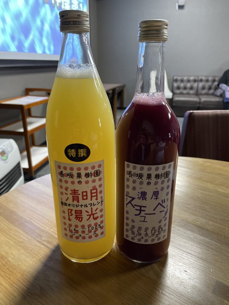 十文字で仕入れてきた、りんご100%ジュース『清明陽光』とぶどう100%ジュース『濃厚スチューベン』です✨✨