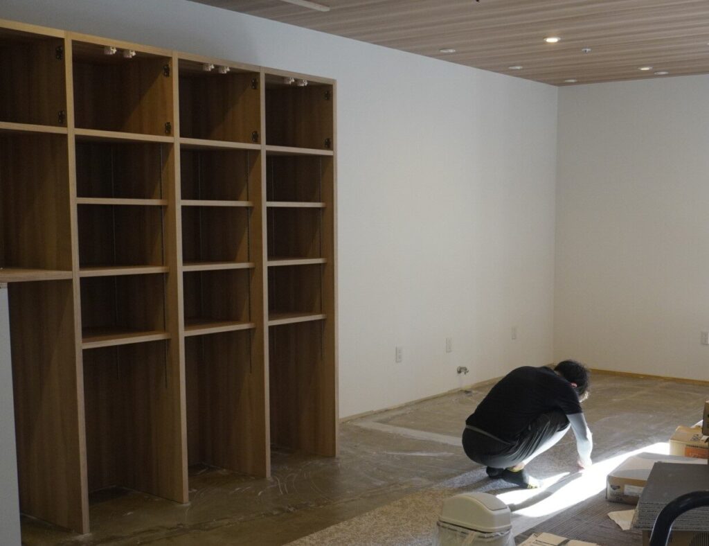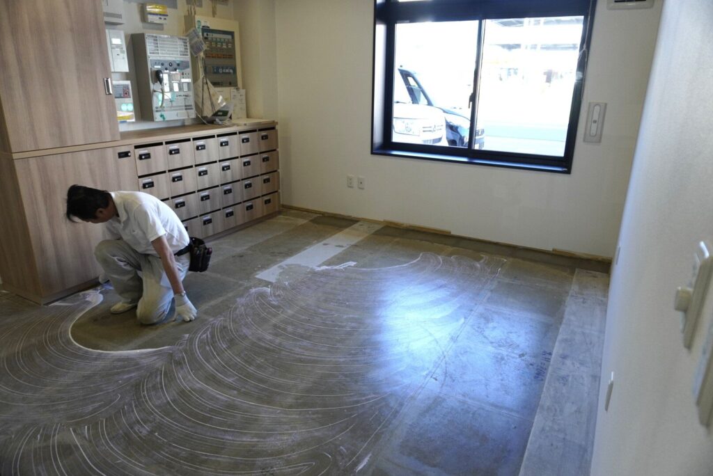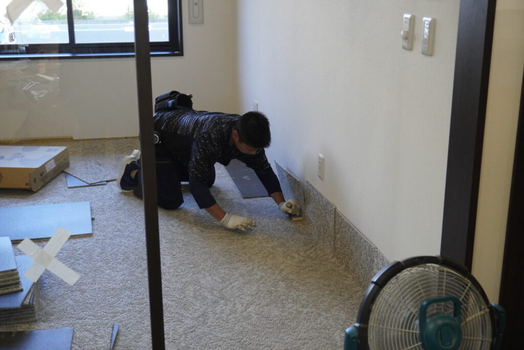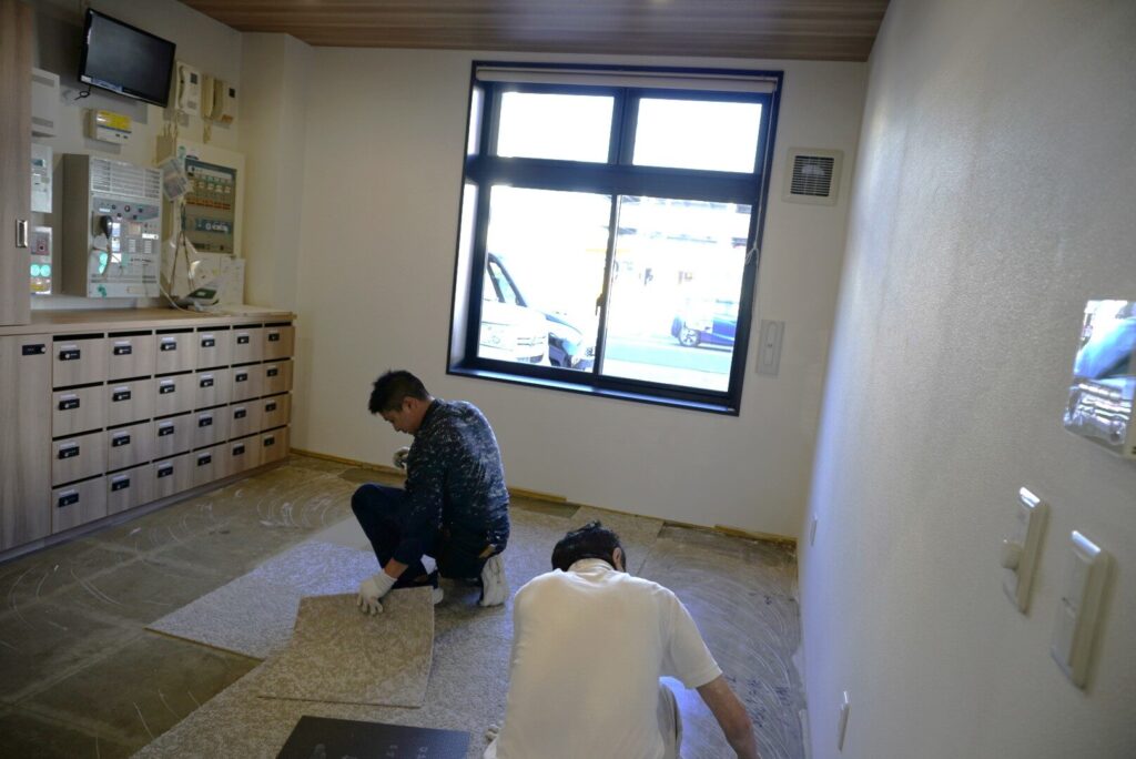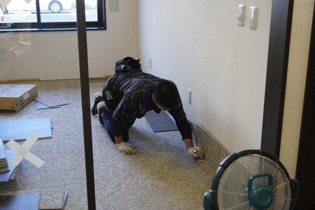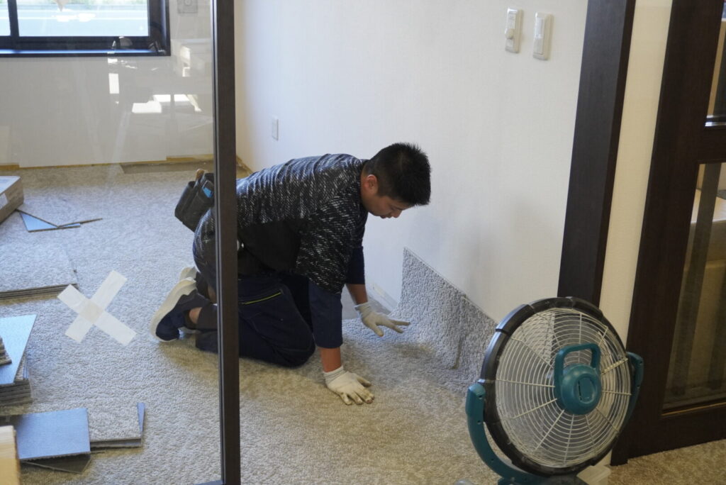 床は、タイミングよくカーペットを貼る前の作業に立ち会うことができ、その様子を見学させていただきました。