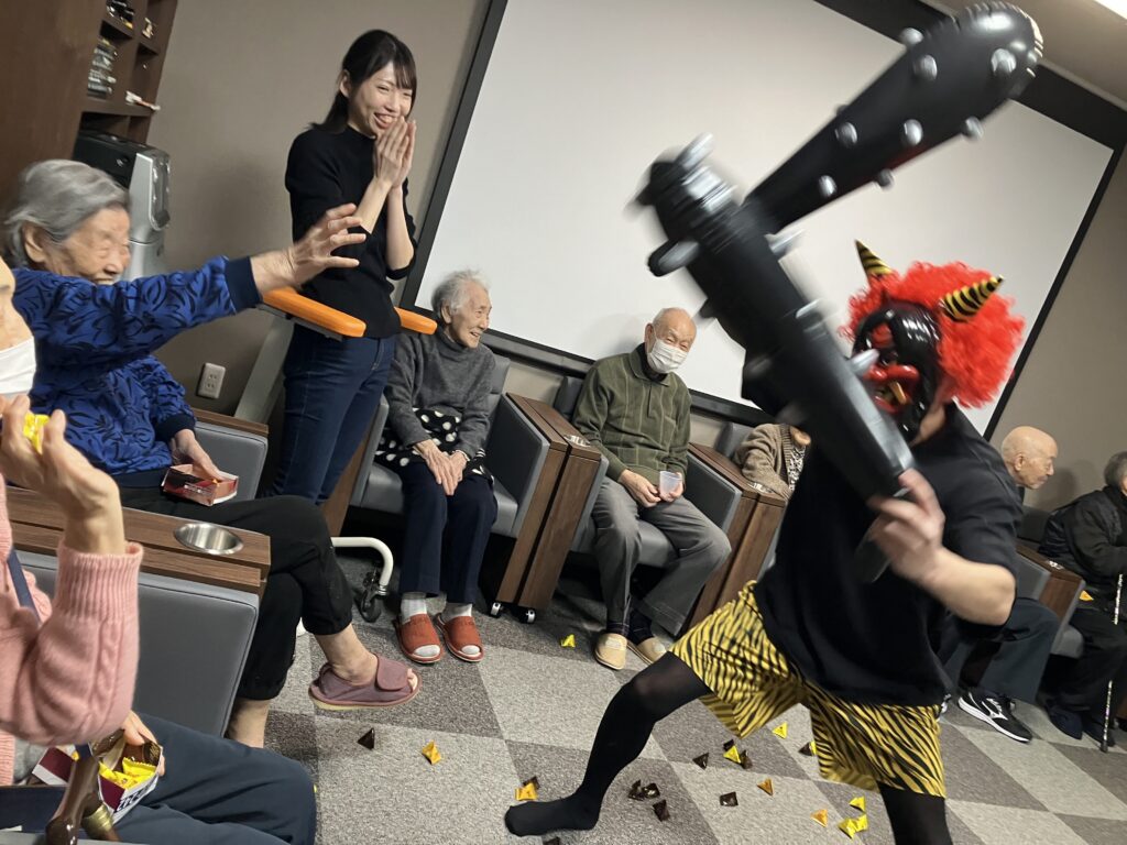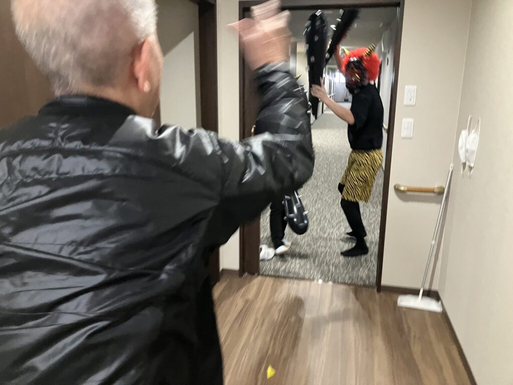 鬼が襲来するも、沢山の豆をぶつけながら、「鬼は~そとぉ~!福は~うちぃ~!!」と威勢の良い掛け声とともに応戦します!(`~´)
