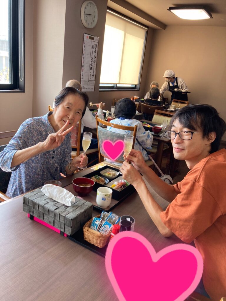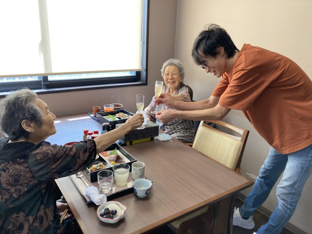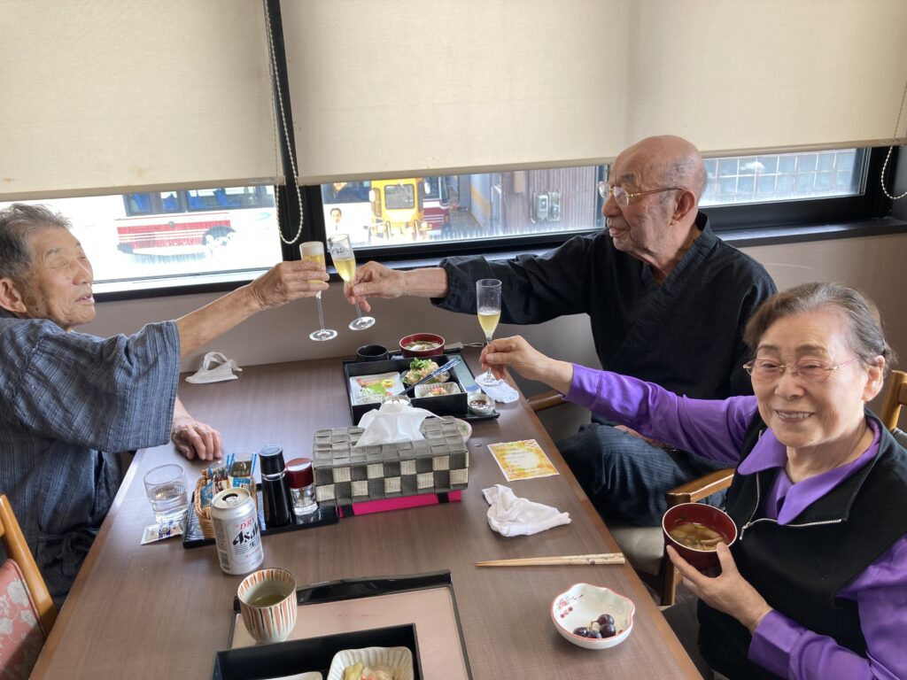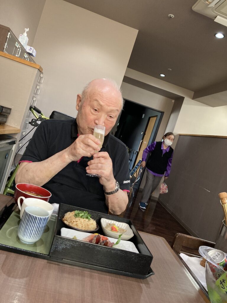 職員も一緒に乾杯させてもらったりしながら、お食事が始まると「お昼がら飲めるのいいな?」「久しぶりにこういう弁当いいな?」などお話されていたり何度も乾杯されている利用者さん達で盛り上がりました?