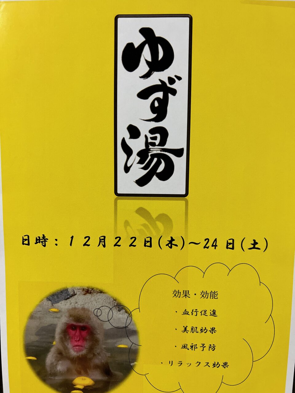 写真はありませんが、温泉以外にも各フロアの特殊浴槽にもゆずを浮かべて温まっていただきました♨️
