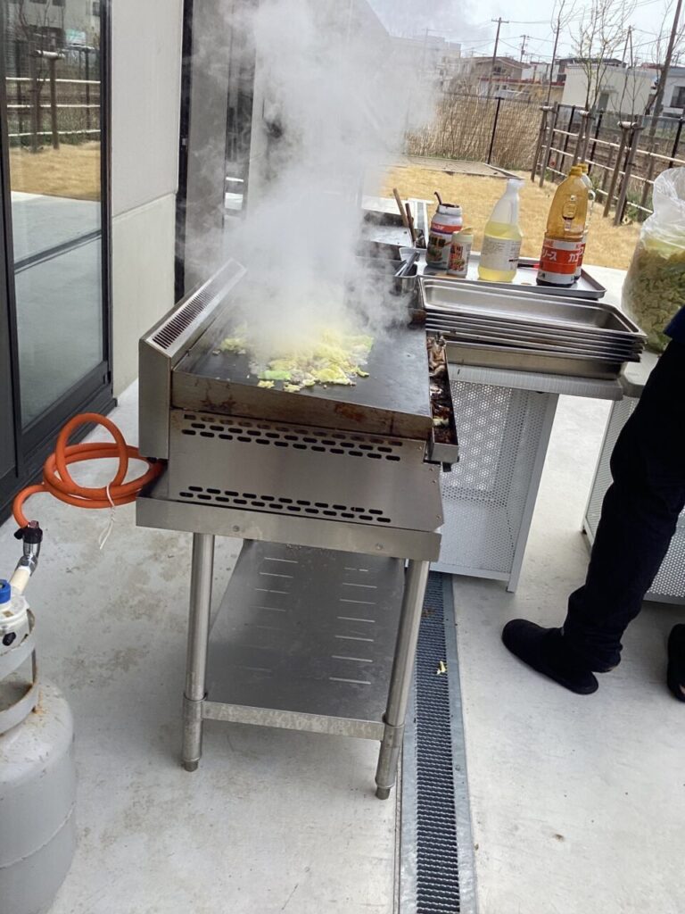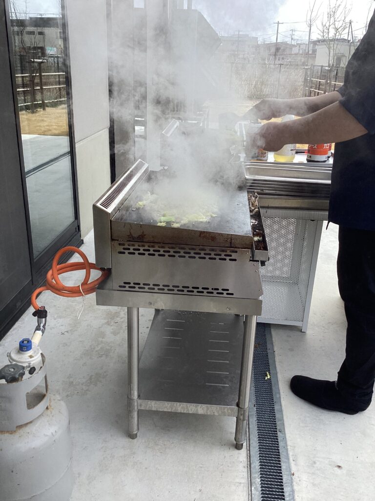 外で、やきそばを焼くと聞いて、みなさんその様子をひとめ見ようと集まりました。