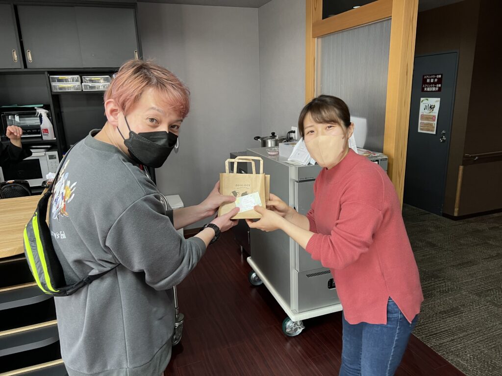 とのことで、なんと‼️自らお菓子の袋を持って各階を回り、ご本人直筆サイン入りのビッグサプライズプレゼントを手渡ししてくださいました?