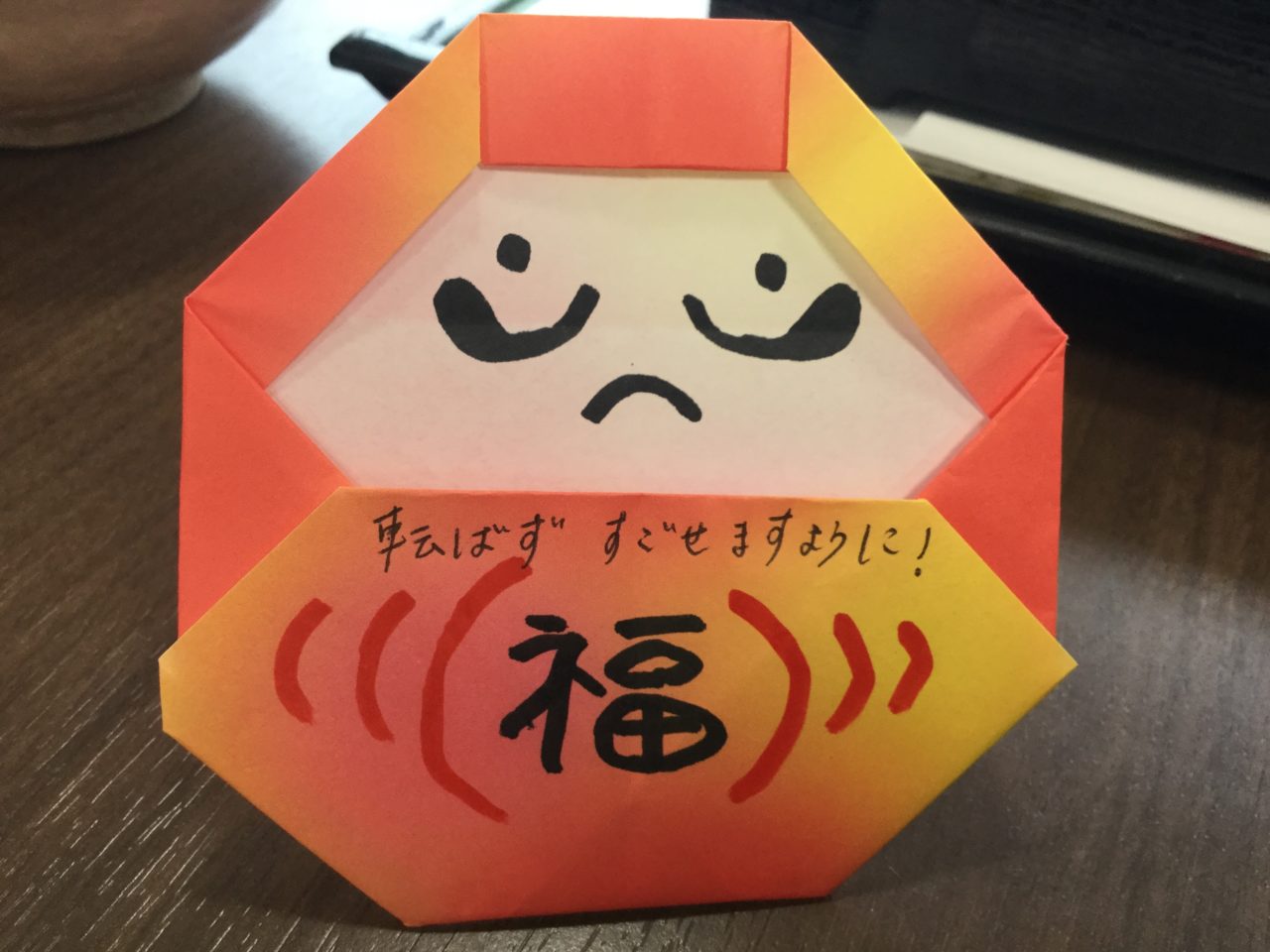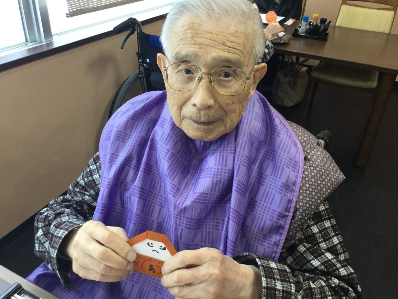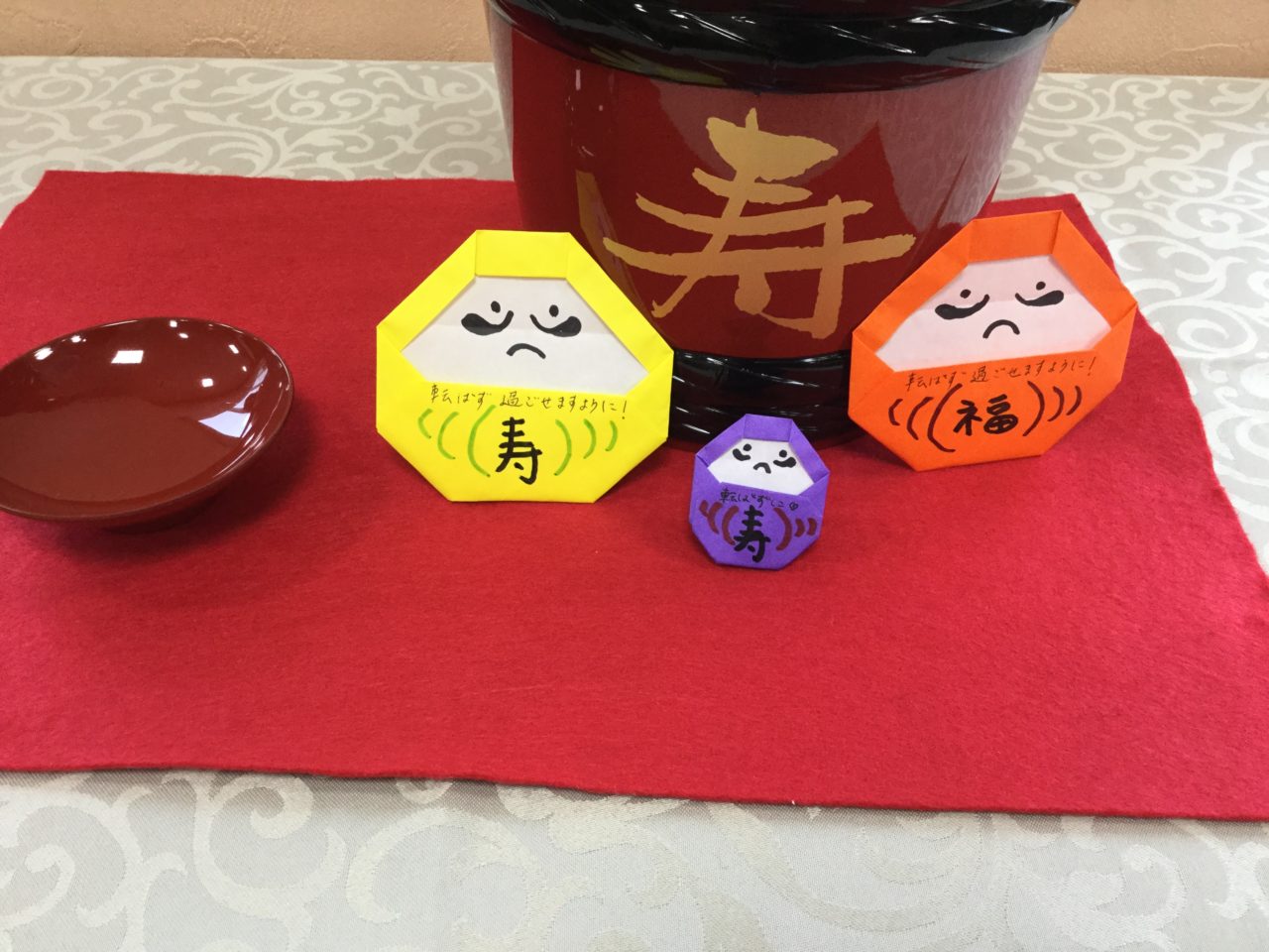 お膳には、皆さん一人一人へ杉田看護師お手製の「転ばぬようにだるま」をつけさせて頂くと「かわいいな。」「お守りにする。」と喜んでくださいました。お神酒も提供させて頂き、「スキッとして美味しい。」「酔っ払っちゃった。」とおっしゃる方も❤️
