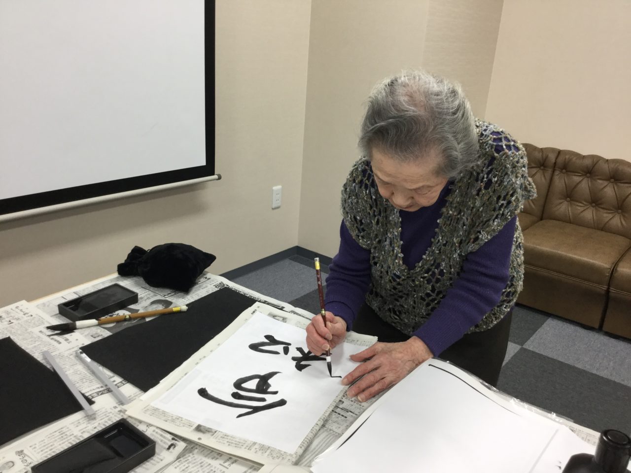 午後からは書き初めを。「賀正」や「令和」など、思い思いの文字を書かれておられました。