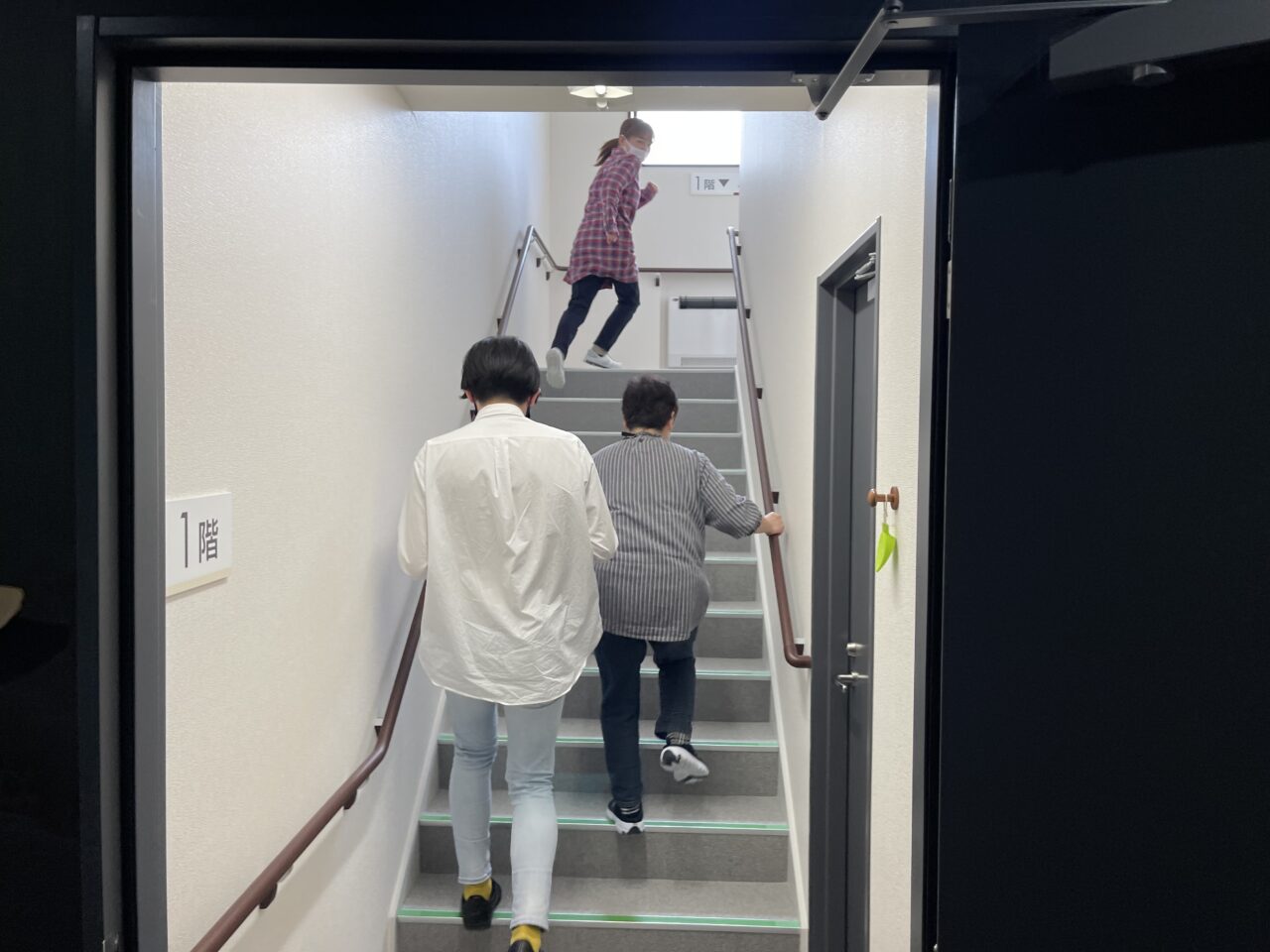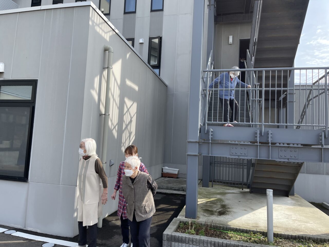 最後に屋外階段から避難する利用者さんと一緒に駐車場を目指します。