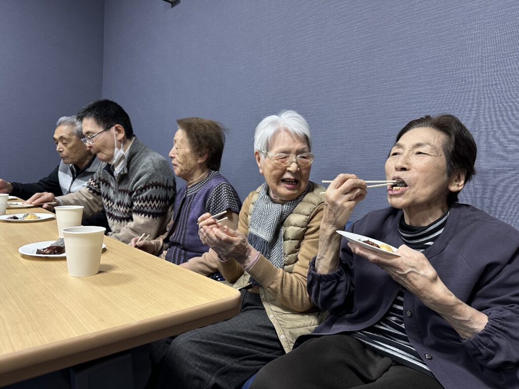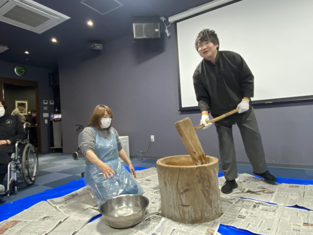 合いの手で手に付いた餅を利用者の方々に「食べれ食べれ!」と言われ一足先につまみ食いしたところ、とっても柔らかく、口に入れた途端とろけました😋