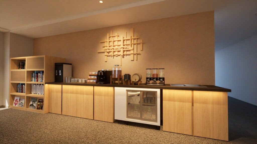 カウンターには、ウイスキーやワイン、コーヒー、ソフトドリンクなど様々なドリンク類とアイスキャンディーやキャンディーディスペンサー等が置いてあり、いつでも好きな時に飲食をして楽しむことができます。