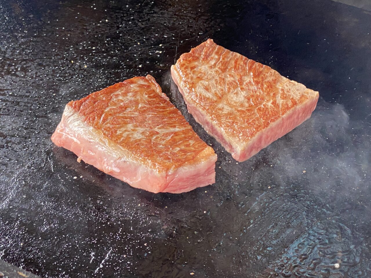 ここでは、熱々の鉄板の上で焼いている由利本荘名物「秋田由利牛ステーキ」?✨や