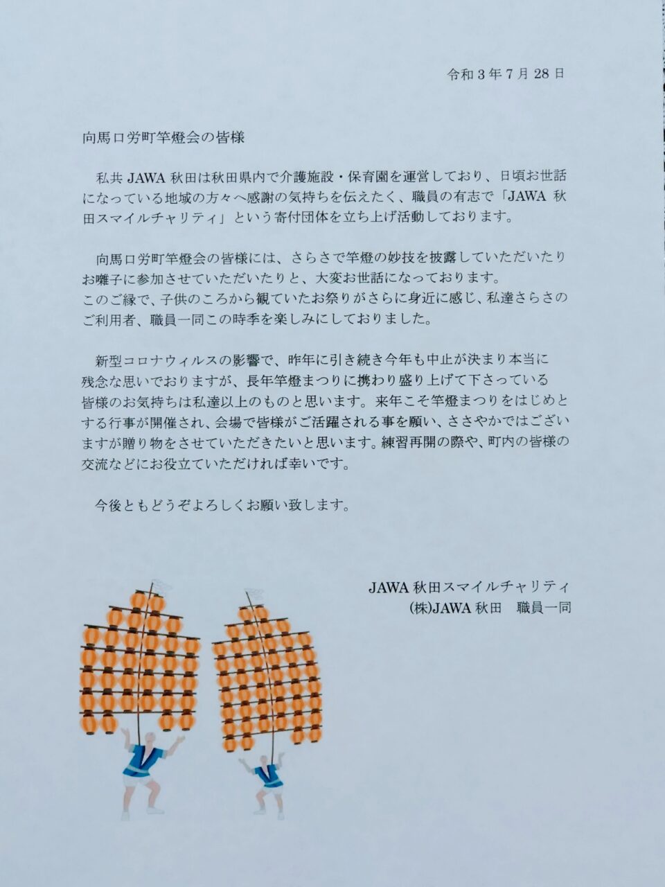 竿燈会の方からは開催中止に伴い練習もできない状態であるとお話を伺い、私たちさらさ秋田駅前のパートナーもニュースをみて残念な思いでした。竿燈会の方々の思いはそれ以上ではないかと思いました。そこでさらさ秋田駅前では秋田の伝統文化竿燈を応援させていただきたいと思い、いつもお世話になっている 向馬口労町竿燈会の 皆様へJAWA秋田スマイルチャリティとして何かお力になれないかとお話を伺いました✨