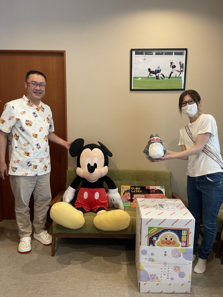 安倍歯科さんに寄贈させていただいた物は、アンパンマンの光る置き物、ジャンボミッキーの人形、トトロの人形、歯医者ごっこの玩具などです🥰