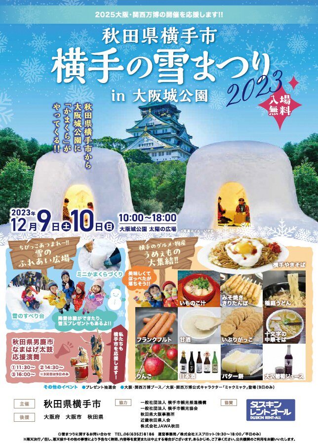 このイベントは、秋田県横手市が横手の雪まつりや秋田県の魅力をPRしようと大阪府、大阪市と秋田県の一般社団法人 横手市観光推進機構と横手市観光協会、秋田県大阪事務所、近畿秋田県人会、ダスキンレントオール、そしてJAWA秋田グループが協力し、開催!!✨