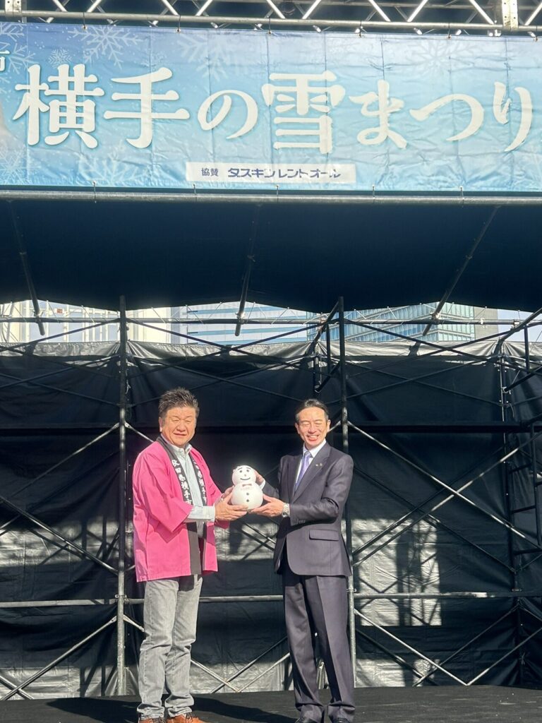 そして今年の「横手の雪まつりin大阪城公園」では、横手市長の髙橋大 様へ社長の南川より、雪だるまの形をした発砲スチロールを2000個寄付しました。