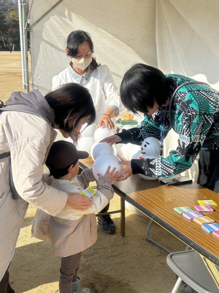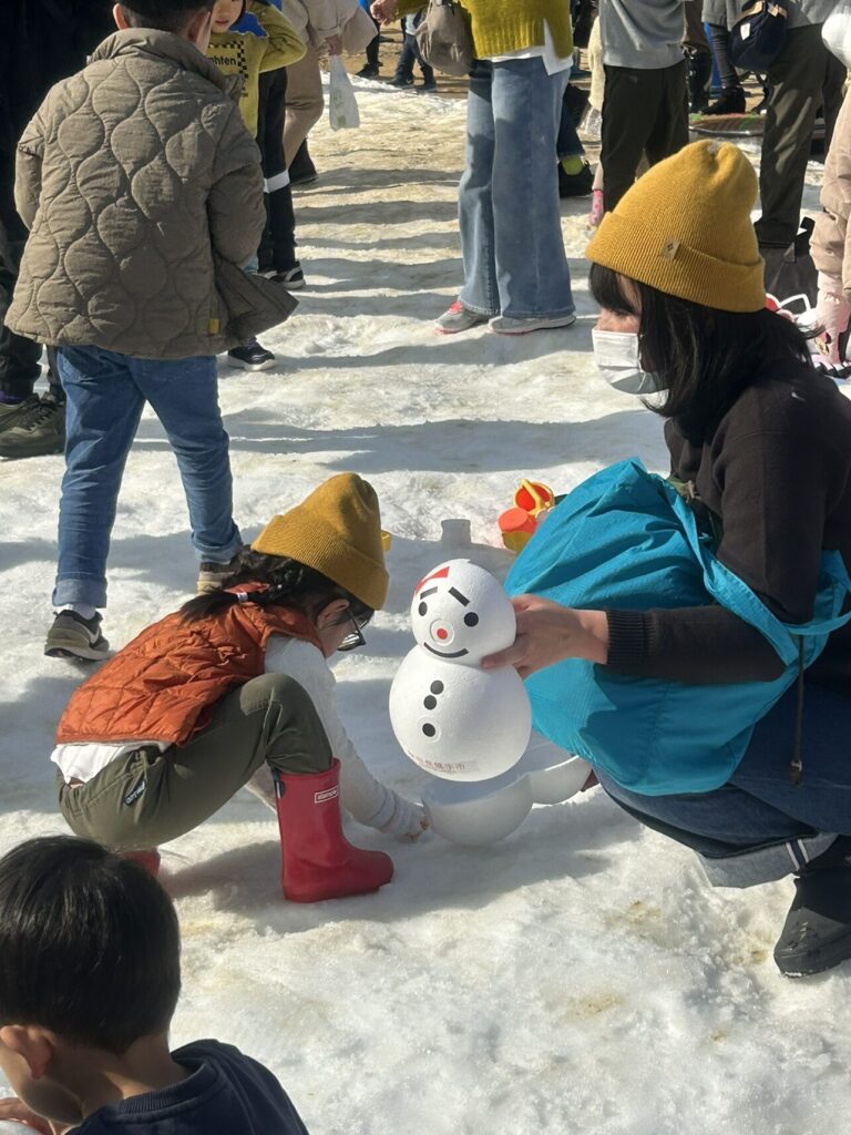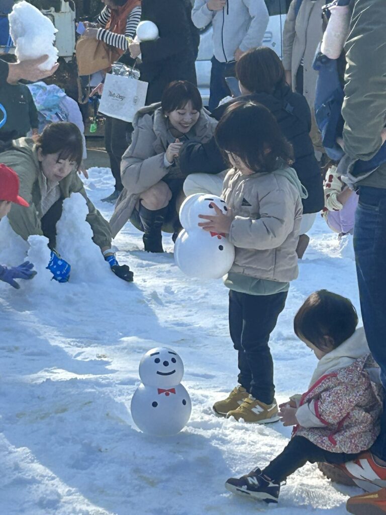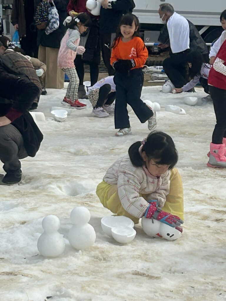 また雪だるまだけでなく、かまくら職人の作った高さ3メートルのかまくら2基や小さなお子さんが雪にふれあえる「雪のふれあい広場」では、ミニかまくらづくりや雪の滑り台、また降雪体験や雪玉のプレゼントがありました。