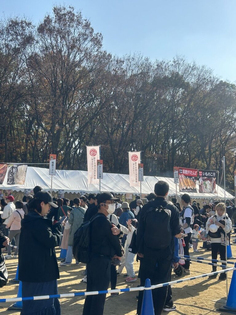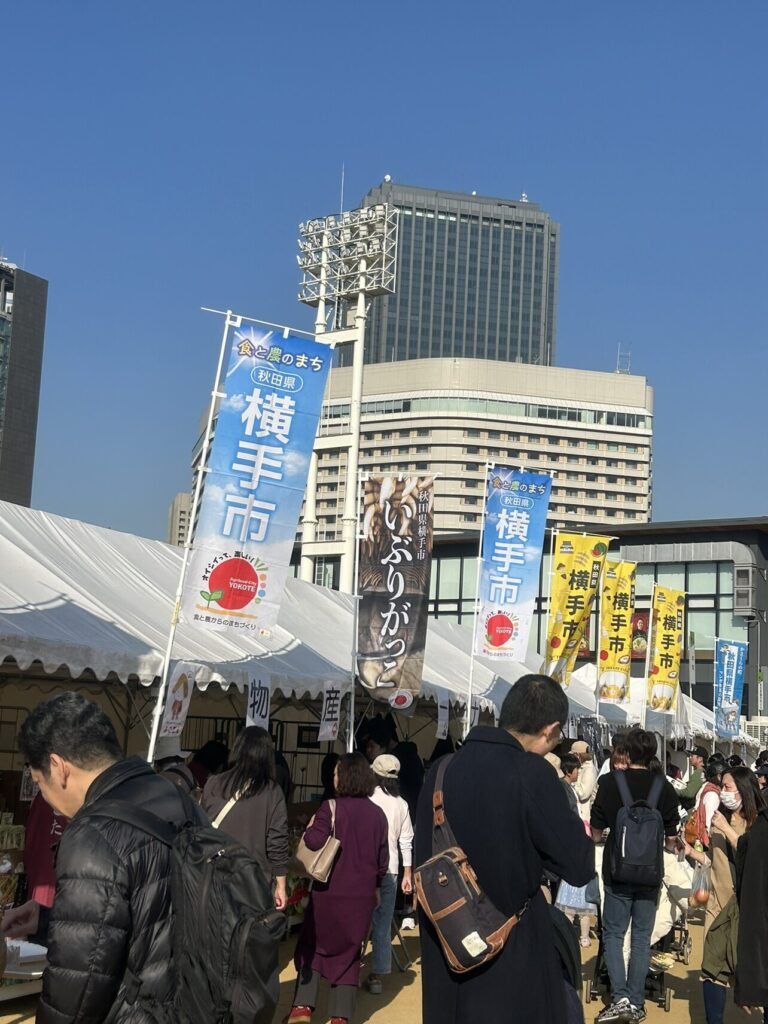販売ブースには、横手焼きそばや横手産のりんご、お酒、他にもみそたんぽや稲庭うどん、いぶりがっこ、バター餅など秋田のグルメや特産品が大集合!