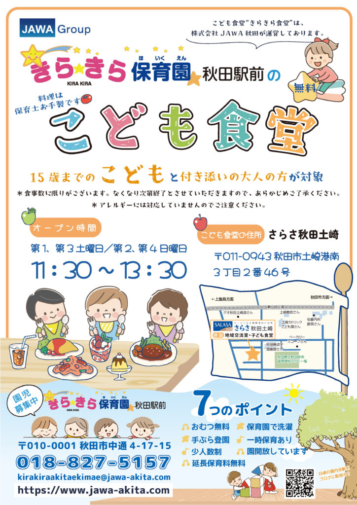 JAWA秋田グループが運営している子ども食堂は、弊社のきらきら保育園の保育士が主催しています。