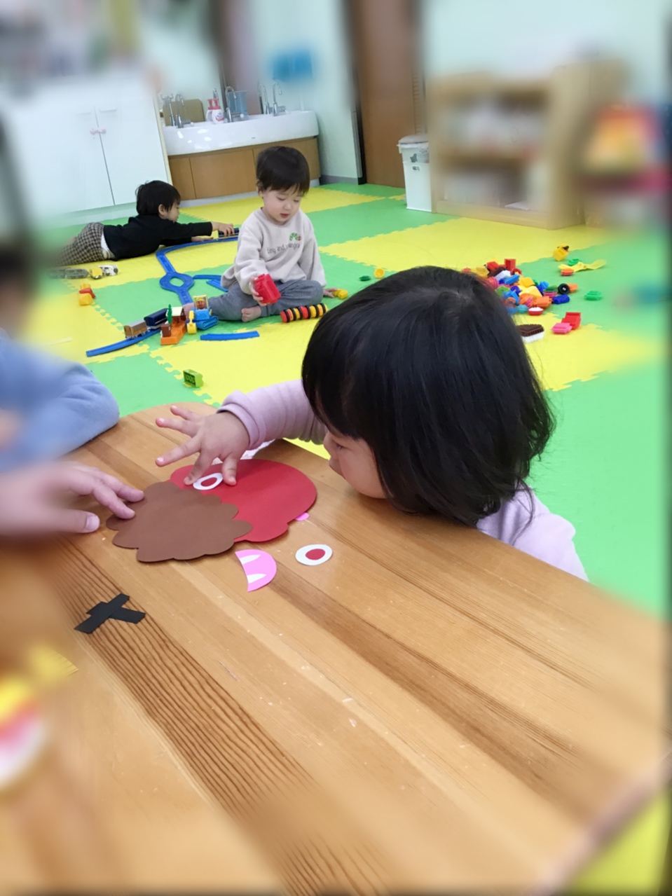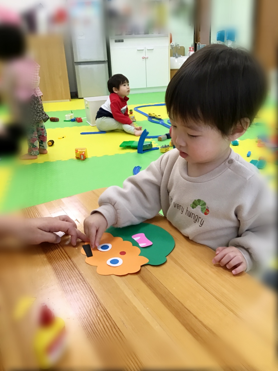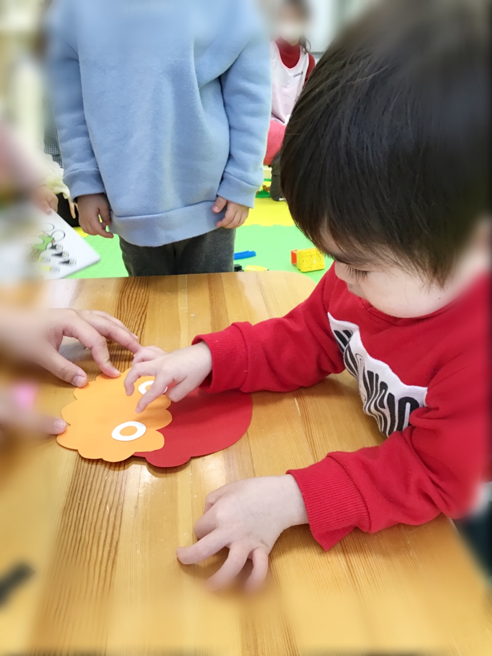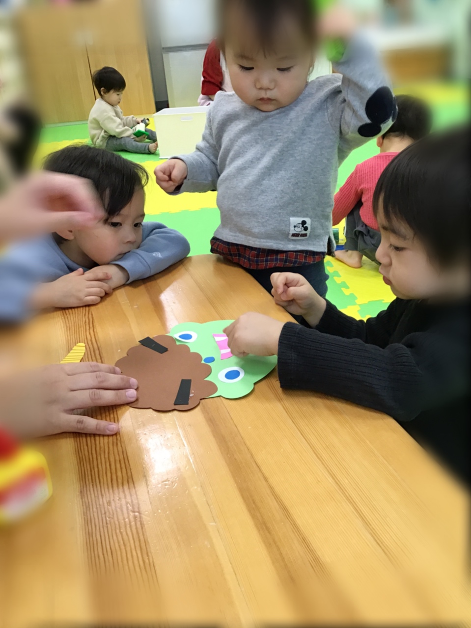 一番小さなお友達のHちゃんは「ここかな〜?」と、保育士と一緒に作りました?