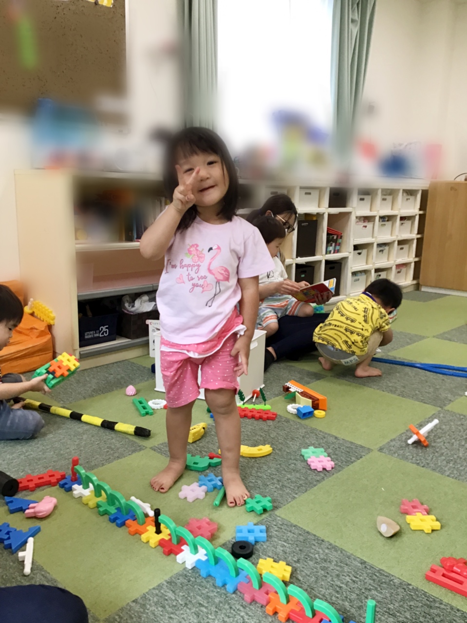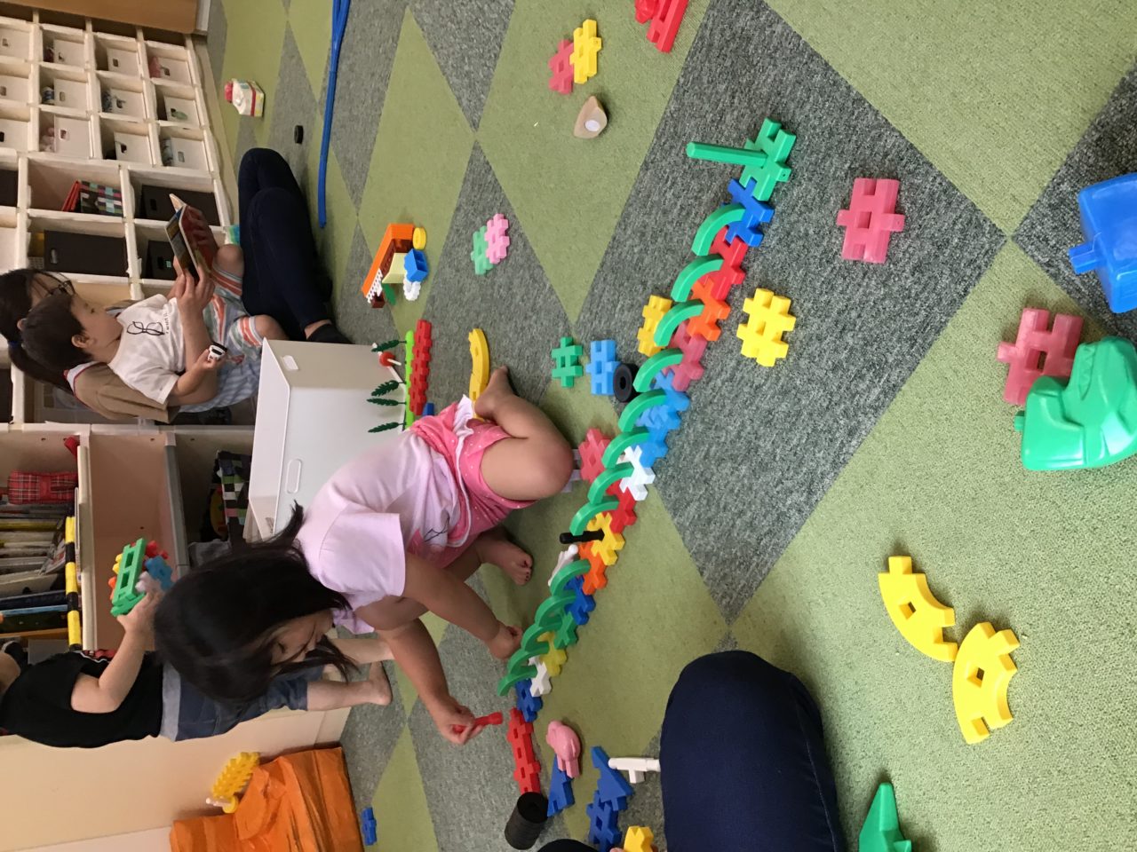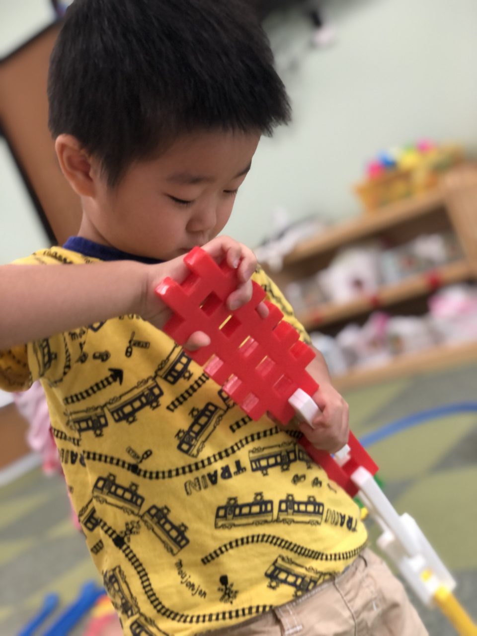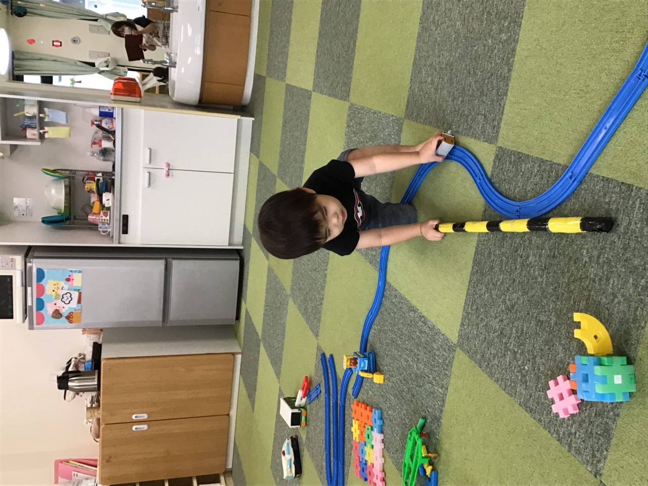 ブロックで踏み切りの棒を作ったり、電車の線路を丸くなるように作りその中で遊んだりするHくん✨