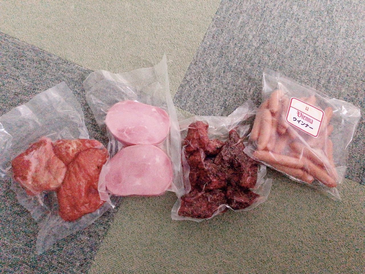 左から、ショルダーベーコン、ボンレスハム、胡椒のついたショルダーベーコン、ポークソーセージです!!
