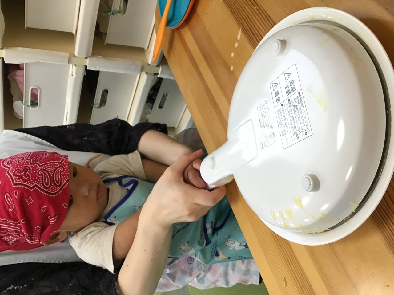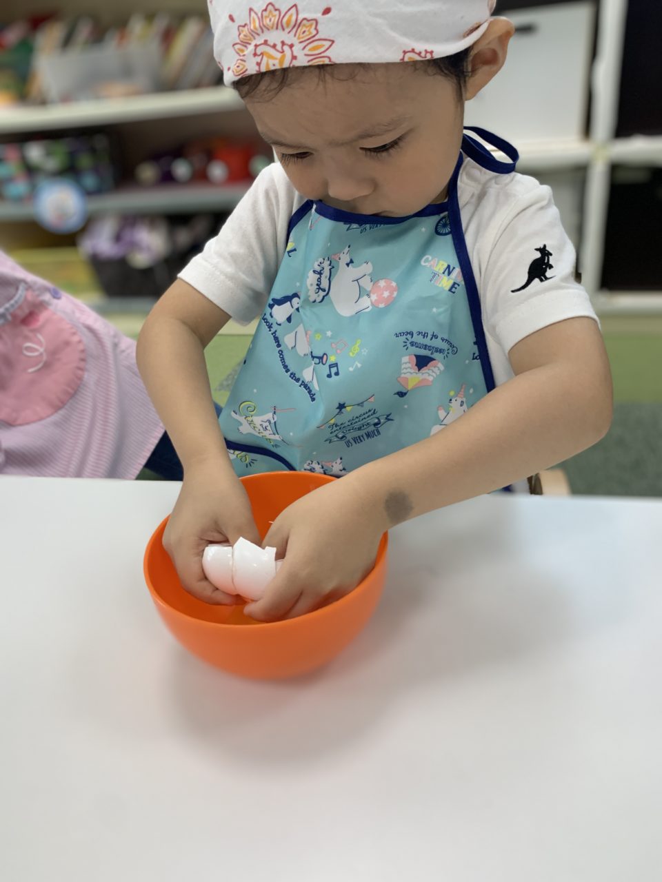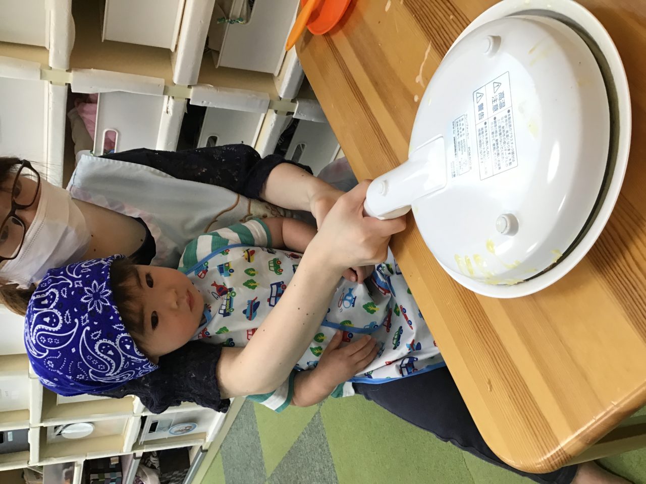 そら組さんには別のお皿で卵を割ってまぜてもらいました?テーブルの角でカンカン…パカッ…まぜまぜおいしくなぁれ☺️