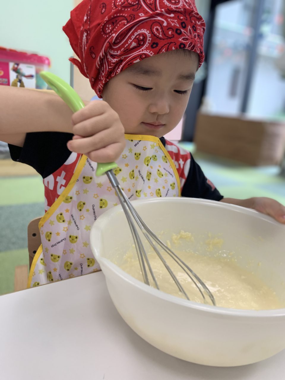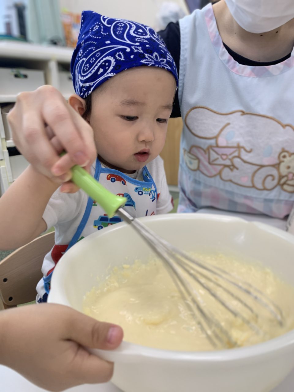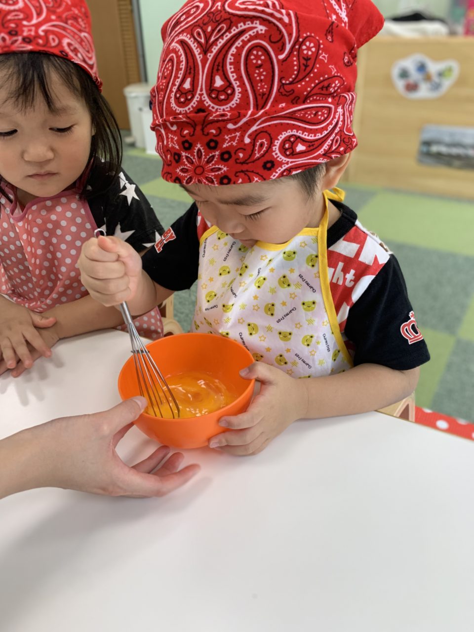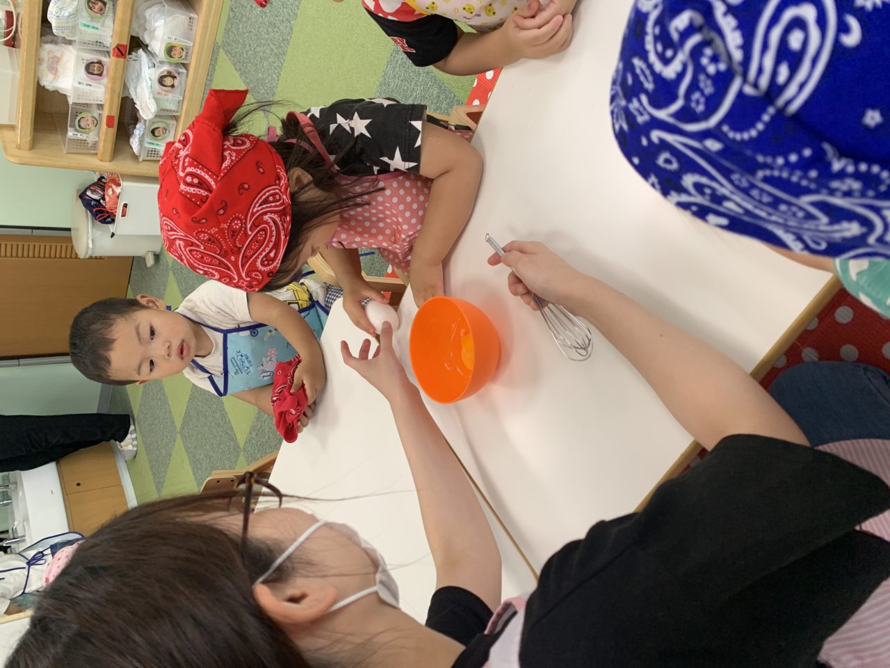 「卵入れる!」「混ぜたいー!」と積極的な子ども達?順番に混ぜていきます?