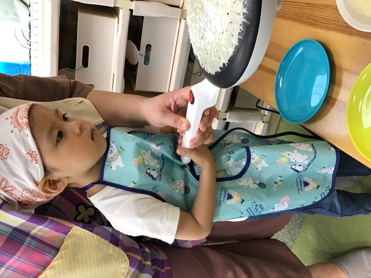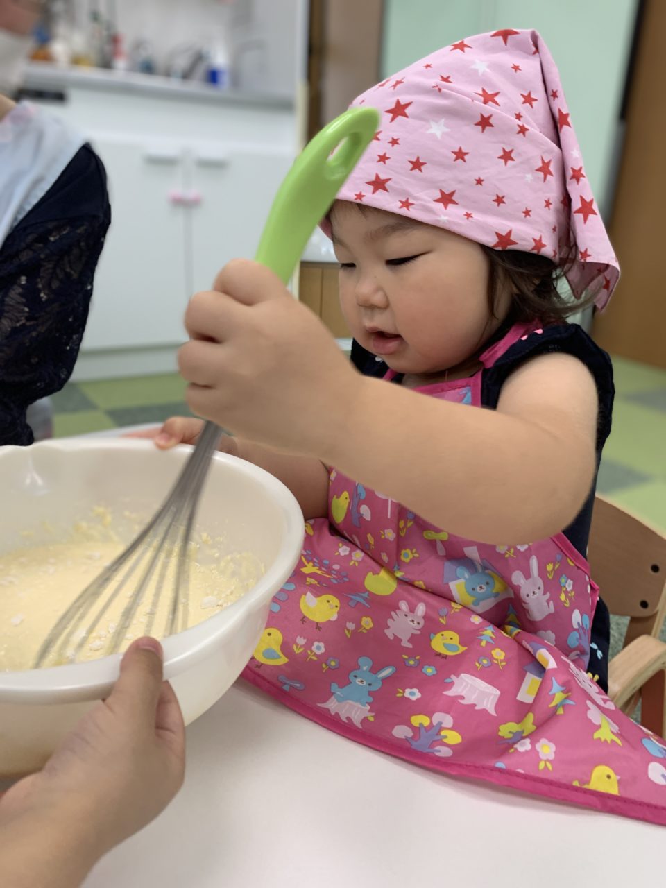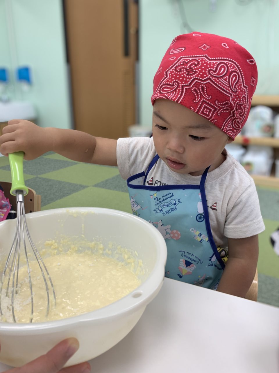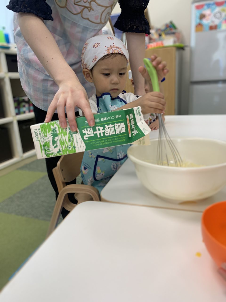 「卵入れる!」「混ぜたいー!」と積極的な子ども達?順番に混ぜていきます?