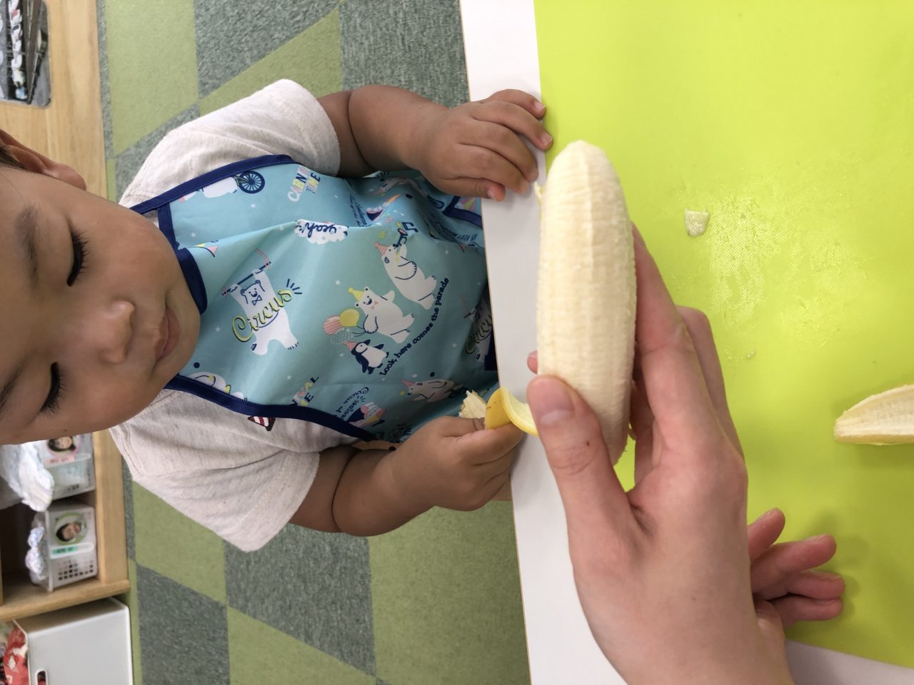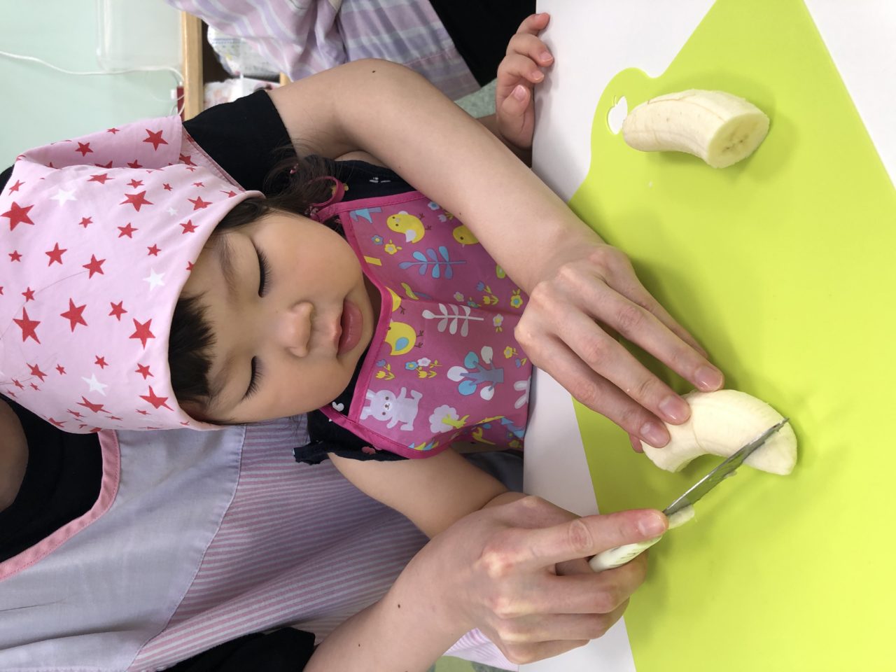 にじ組さんで保育者と一緒にバナナを切ります?包丁を見てしっかり切ることができています?