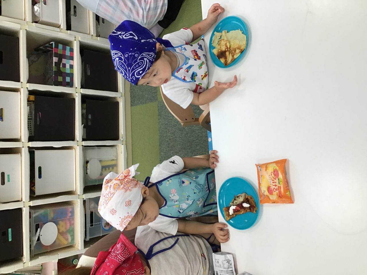 上手に手で持ってパクリと食べます?あったかい生地に冷たいクリームとフルーツ!勢いよく食べる子ども達?