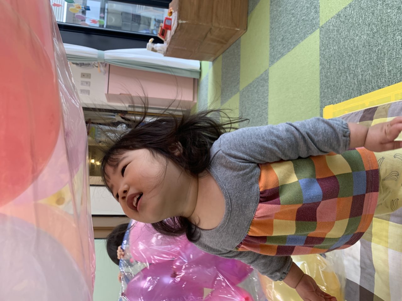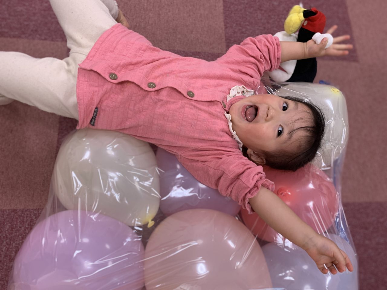 先日、バルーンベットを作って遊びましたよ〜?2歳児さんはダイナミックに遊んでいます✨躍動感満載です??