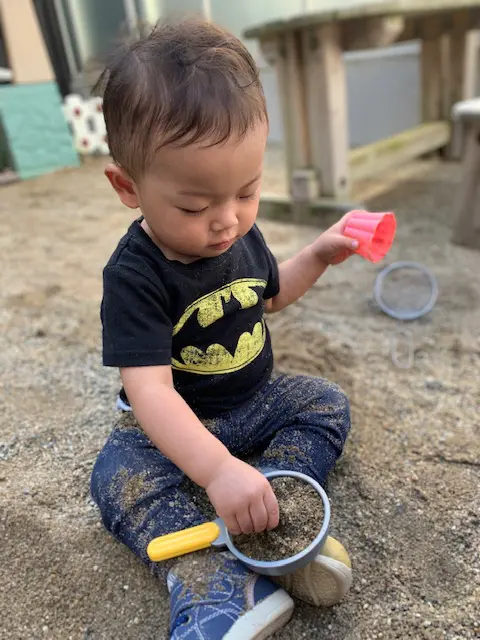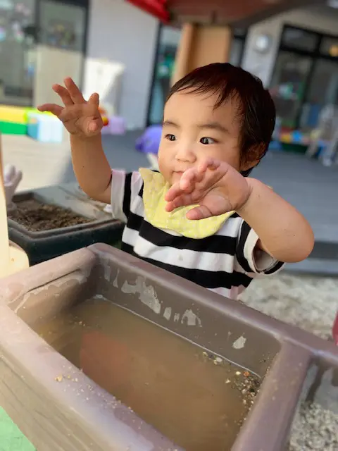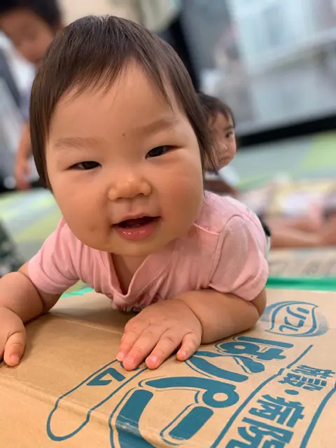 0歳児さんは歩くのも上手になって、室内戸外構わず、気になるものや見たものに向かってトコトコ歩いては手に取り遊んでいます!