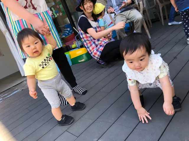0歳児さんも靴を履いてテラスをたくさん歩いています!