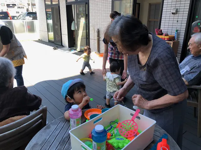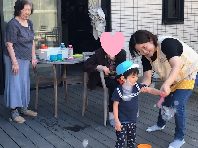 保育園ではテラスと保育室を開放し、昔ならではの竹とんぼをご利用者さんに教えてもらいながら飛ばして楽しみました★
