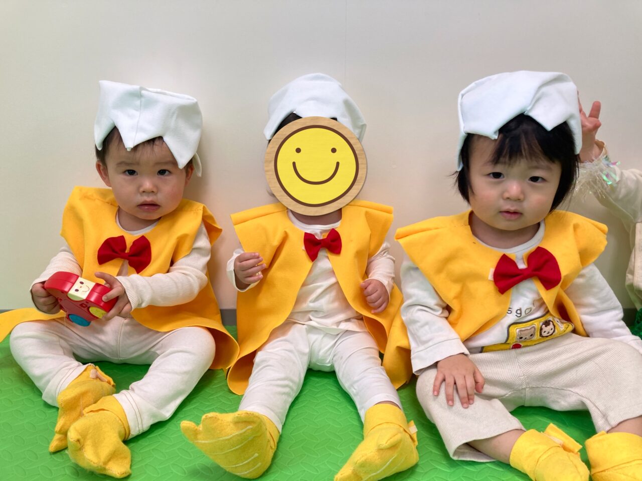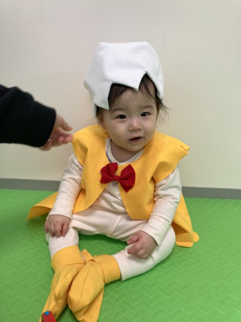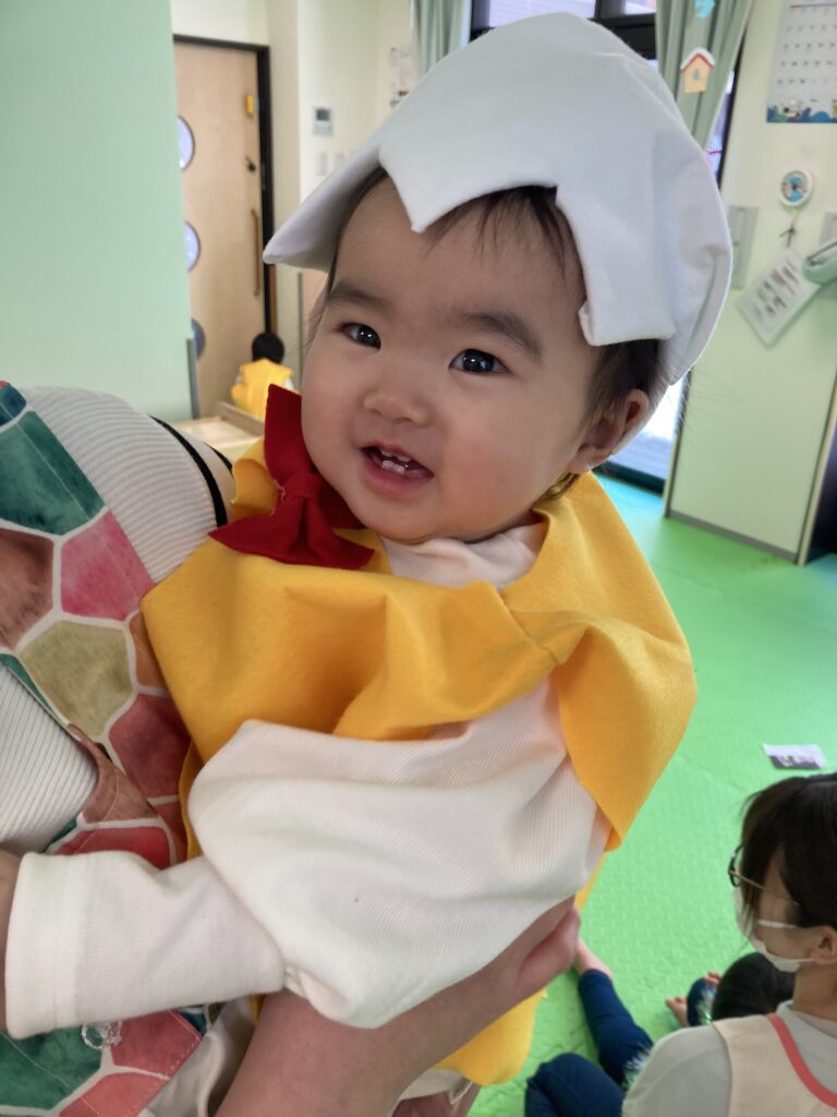 はじめの発表は、ひよこ組による「たまごたまご」です?手作りのひよこの衣装を着て、とっても可愛らしいひよこに変身です?