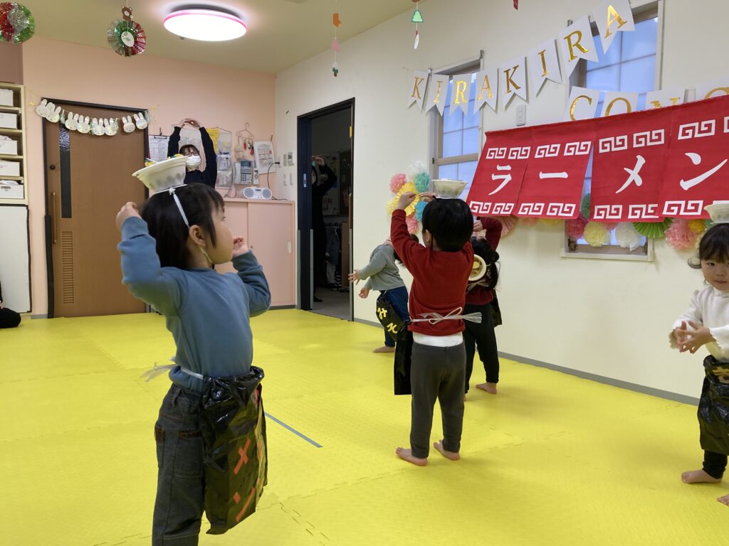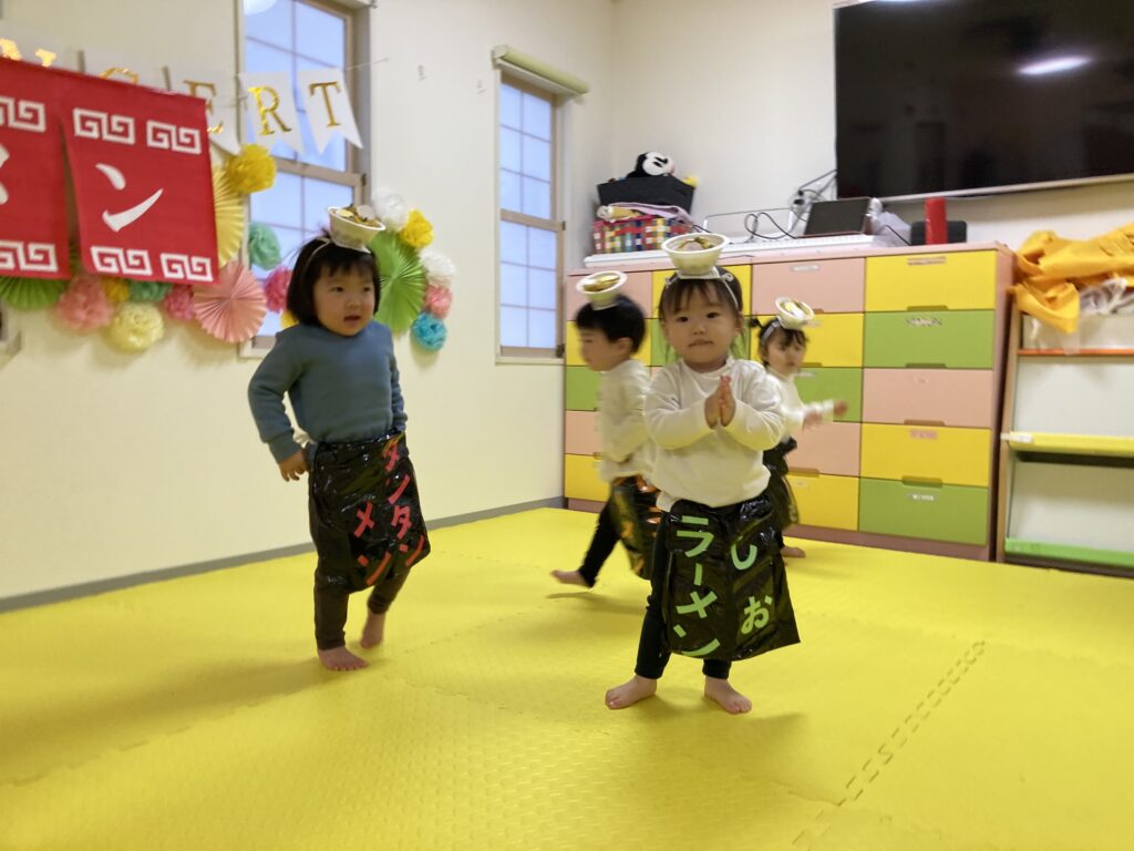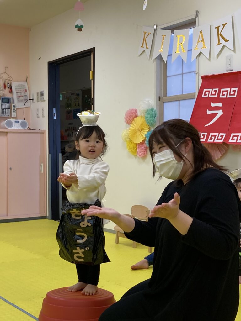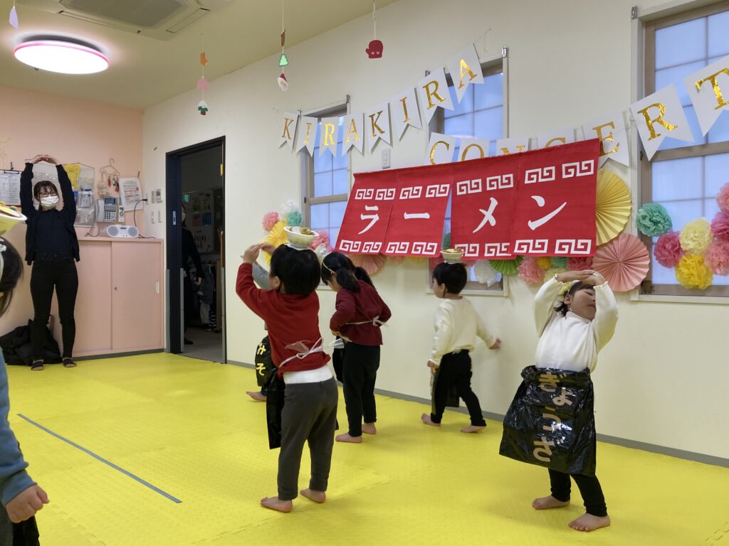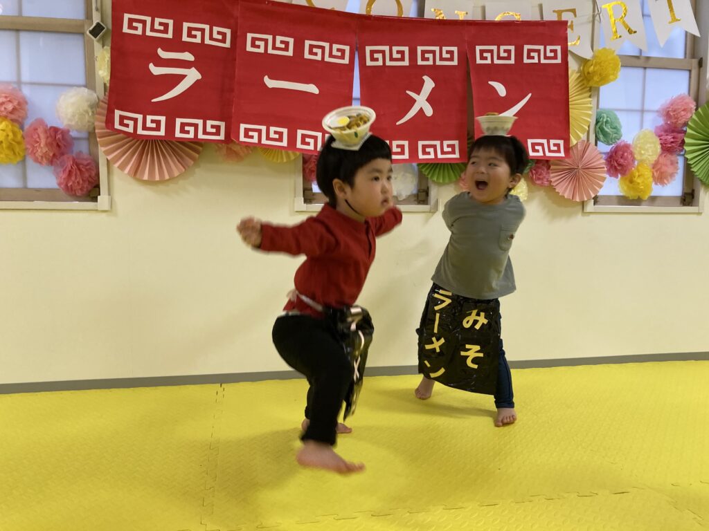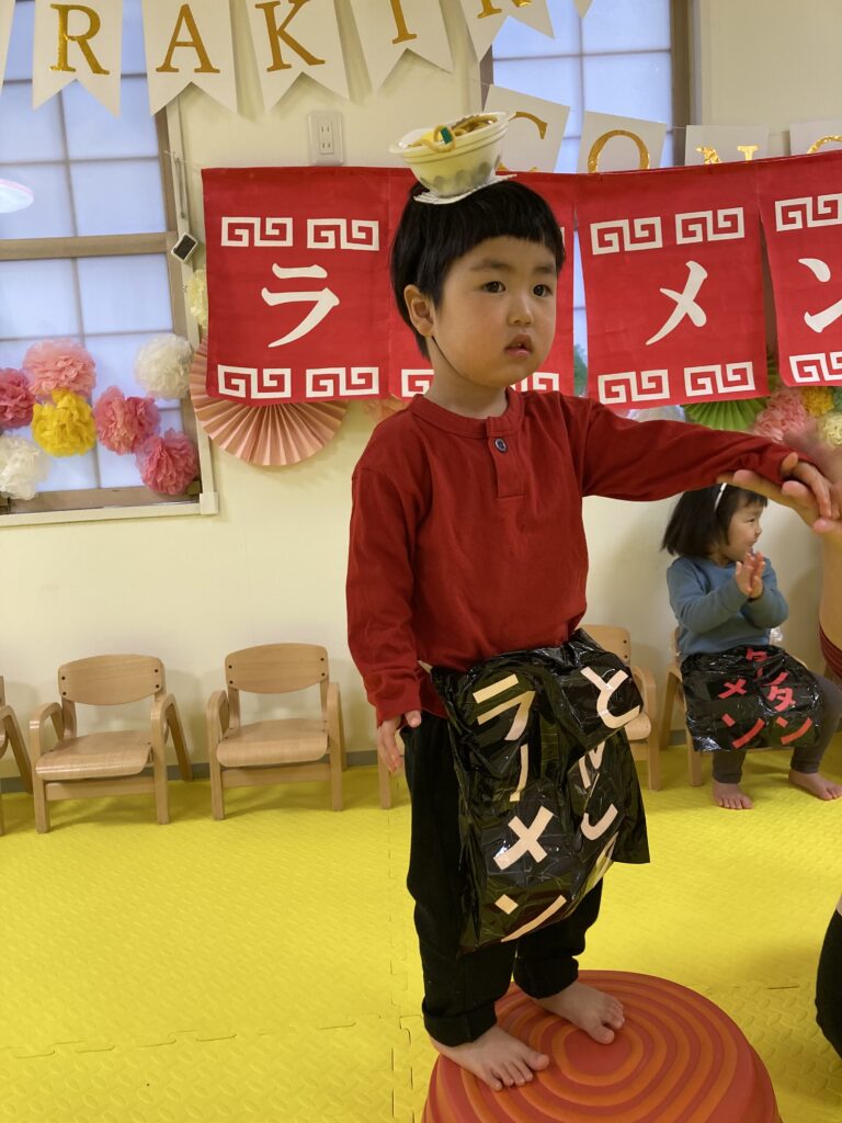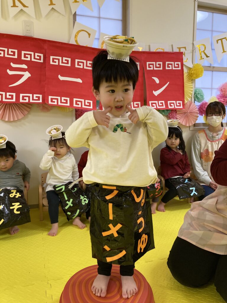 最後は、にじ、そら組の「ラーメン召し上がれ」です?ラーメン屋さんに変身した子ども達。1人ずつ登場しドキドキしながらも保育士の質問に答えてくれました!☀️☺️
