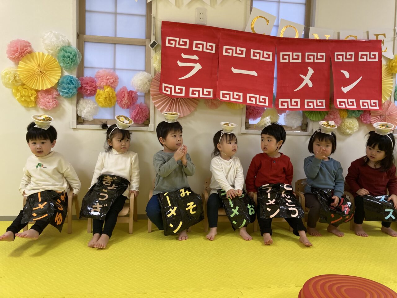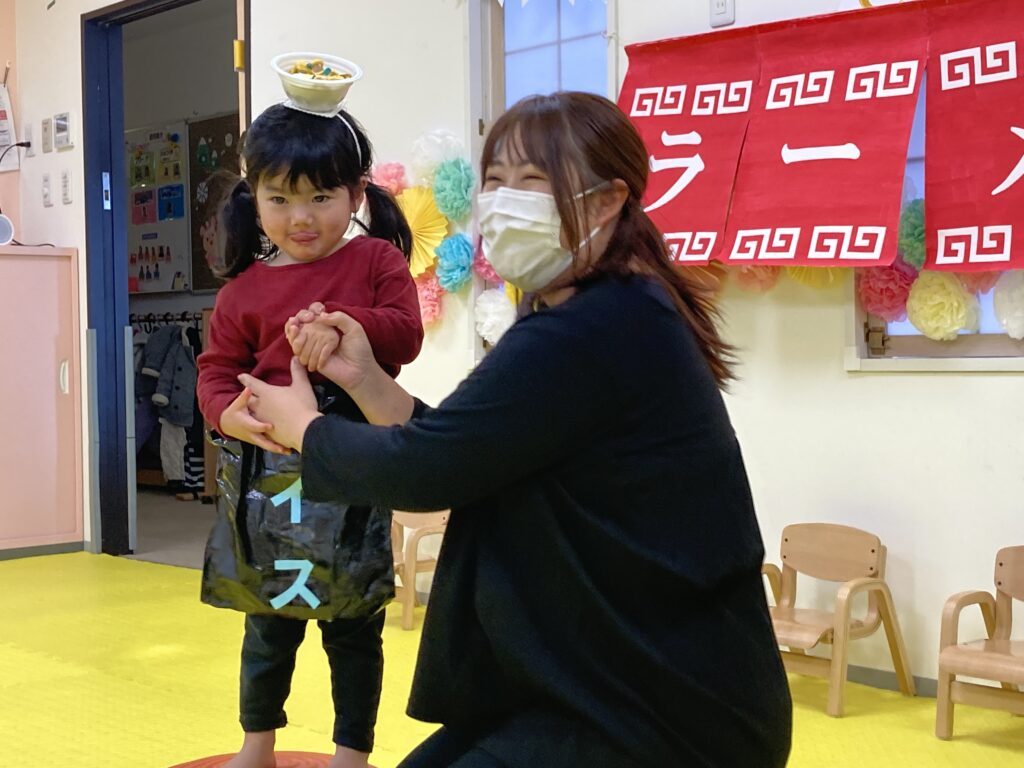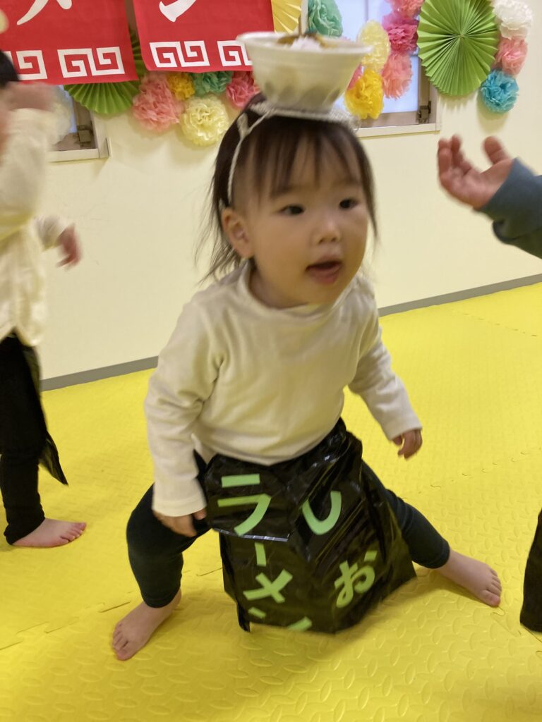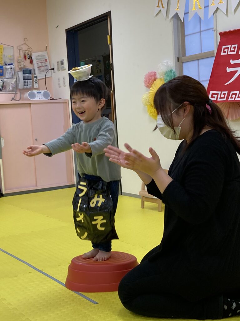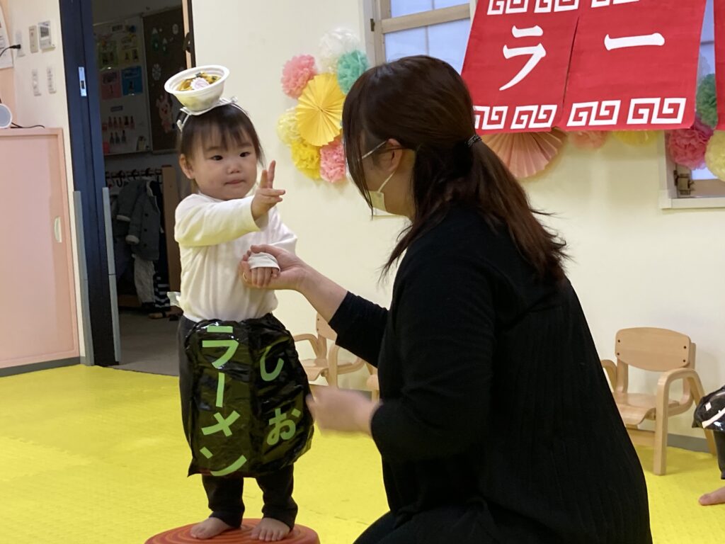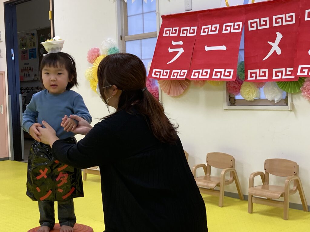 最後は、にじ、そら組の「ラーメン召し上がれ」です?ラーメン屋さんに変身した子ども達。1人ずつ登場しドキドキしながらも保育士の質問に答えてくれました!☀️☺️