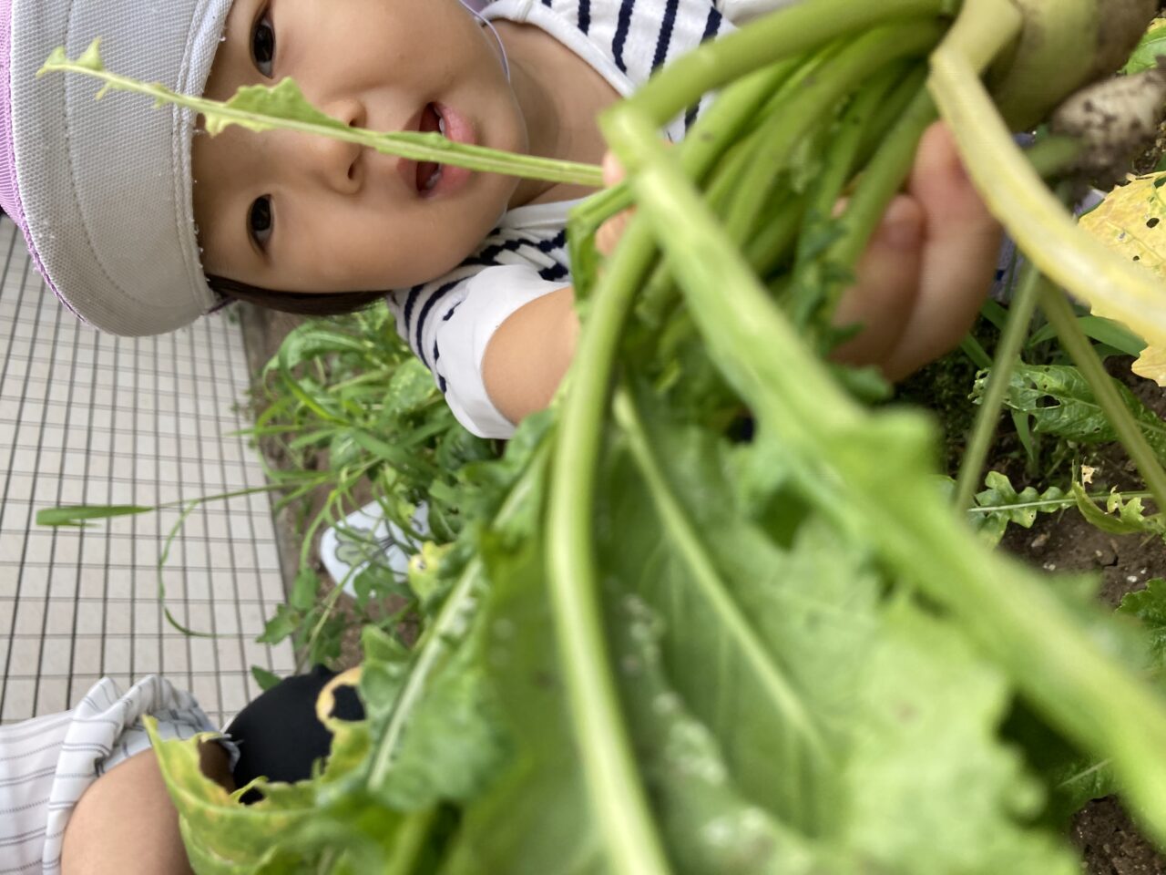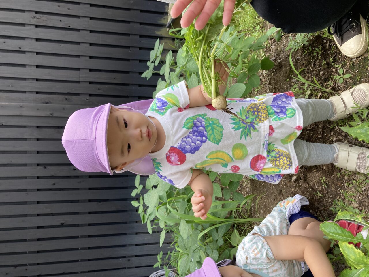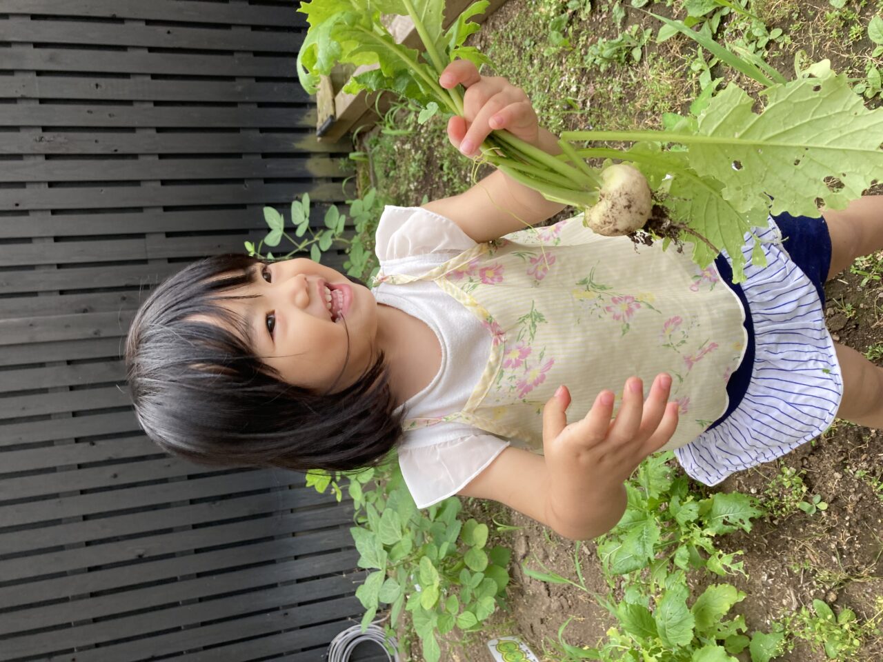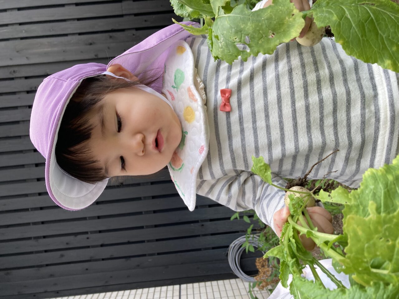 春にみんなで種を植えたカブと枝豆が大きくなったので収穫しました??
