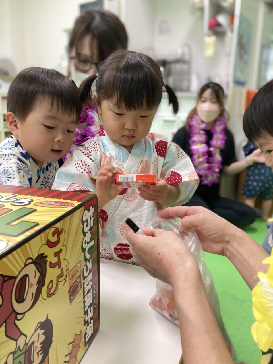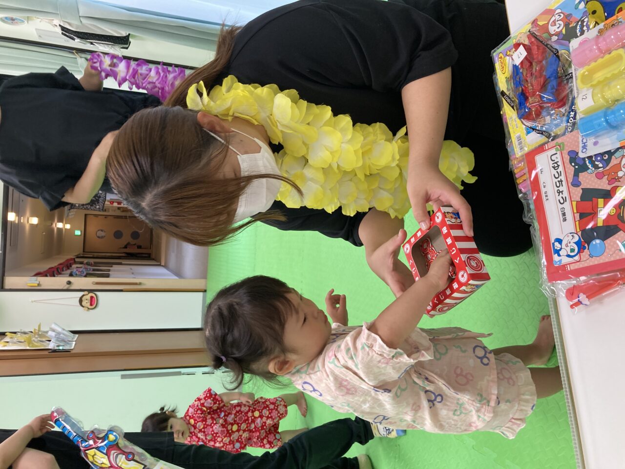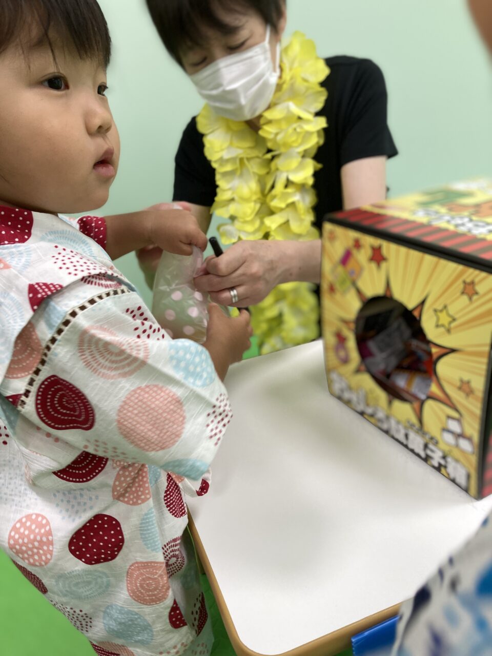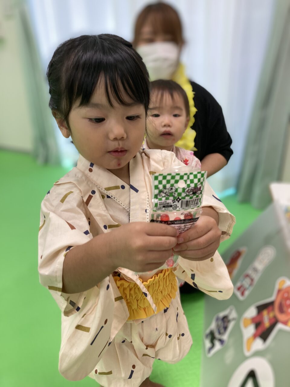 今年度も保護者の方の参加は叶いませんでしたが、お迎えの時に少しでもお祭り気分をと思い、お菓子の紐引きくじをしました〜??✨子ども達も「んーどれにしようかな?」「うあー、すごい?」と喜んでいました。