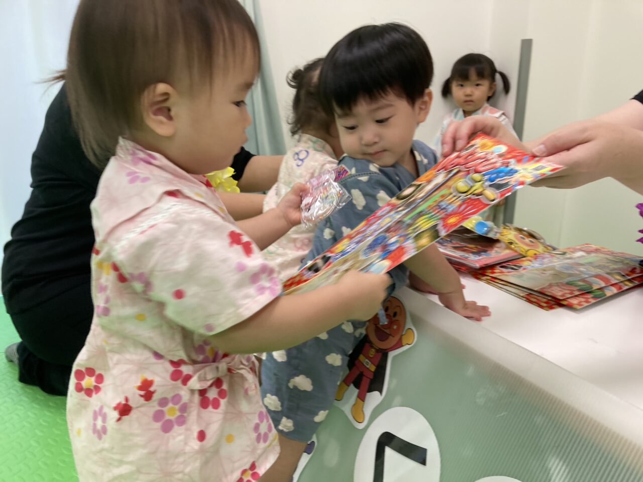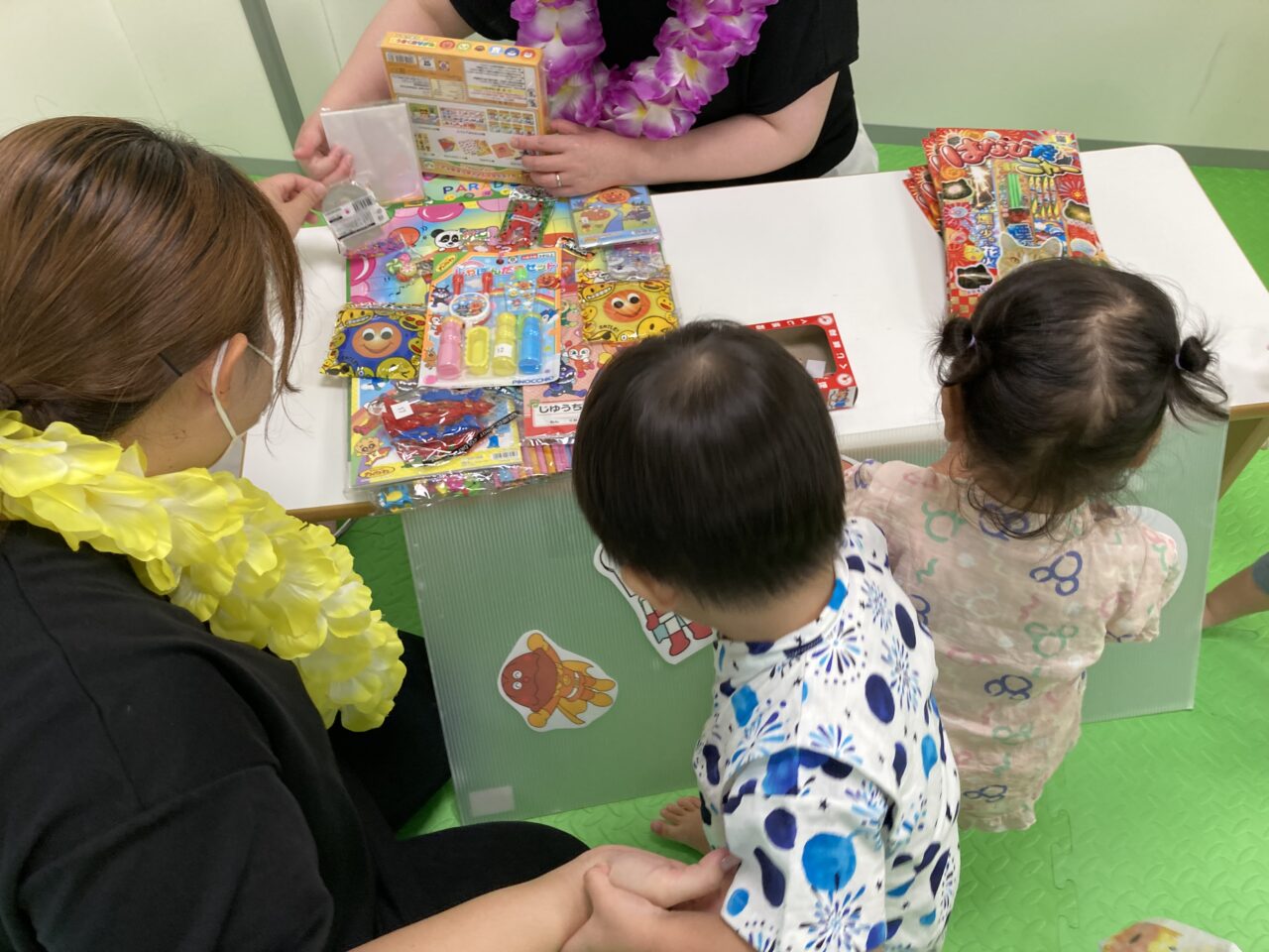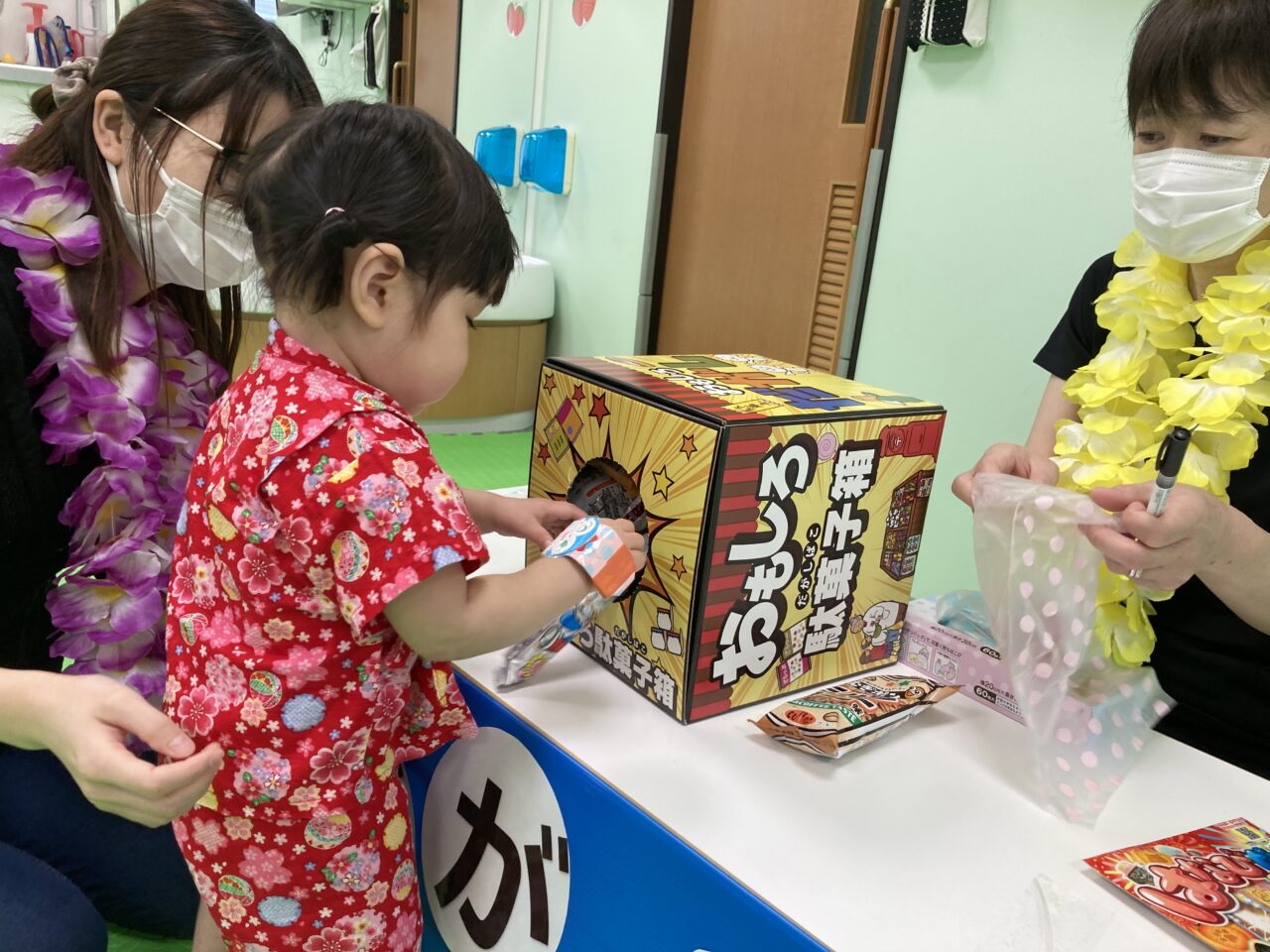今年度も保護者の方の参加は叶いませんでしたが、お迎えの時に少しでもお祭り気分をと思い、お菓子の紐引きくじをしました〜??✨子ども達も「んーどれにしようかな?」「うあー、すごい?」と喜んでいました。