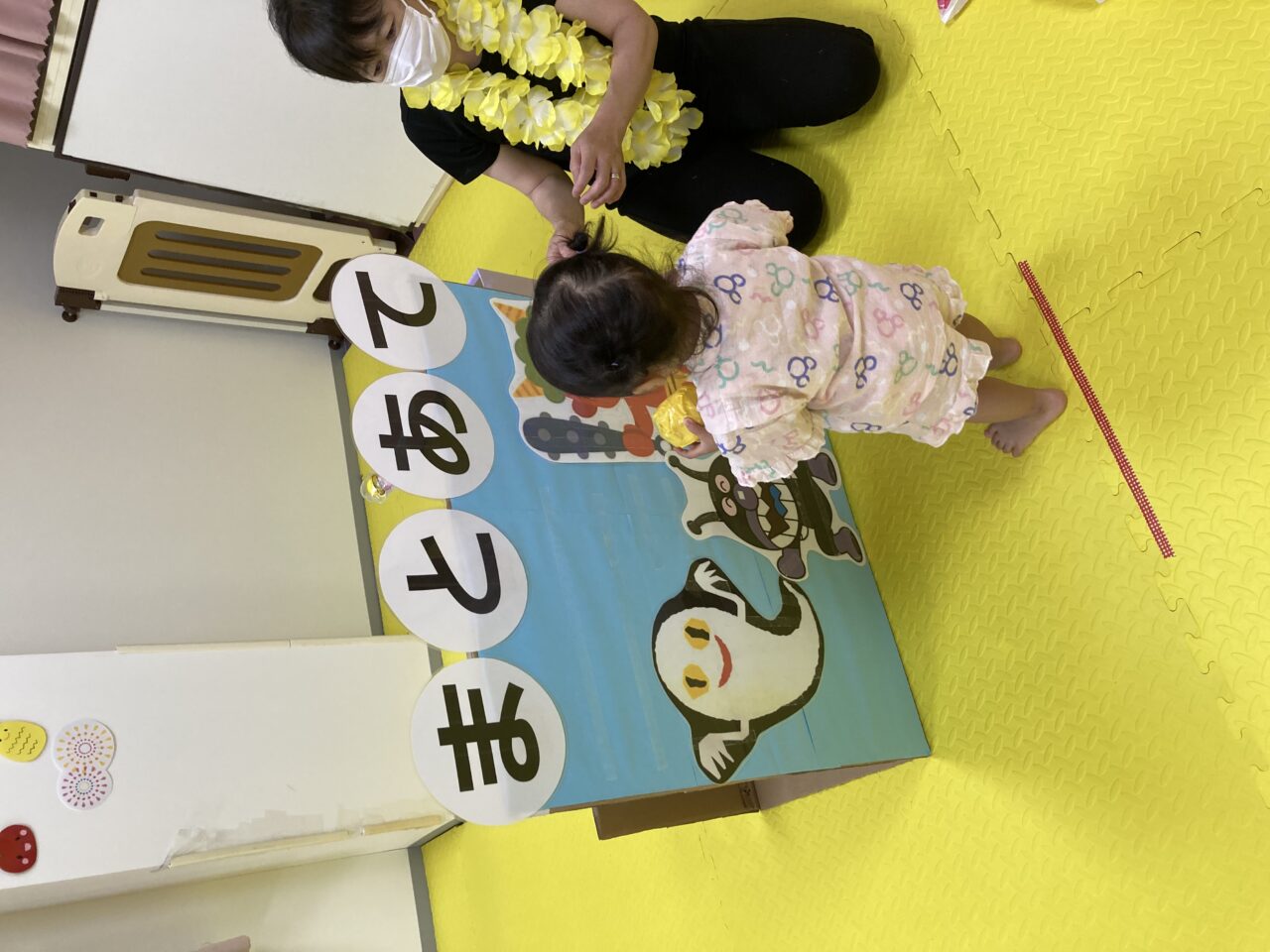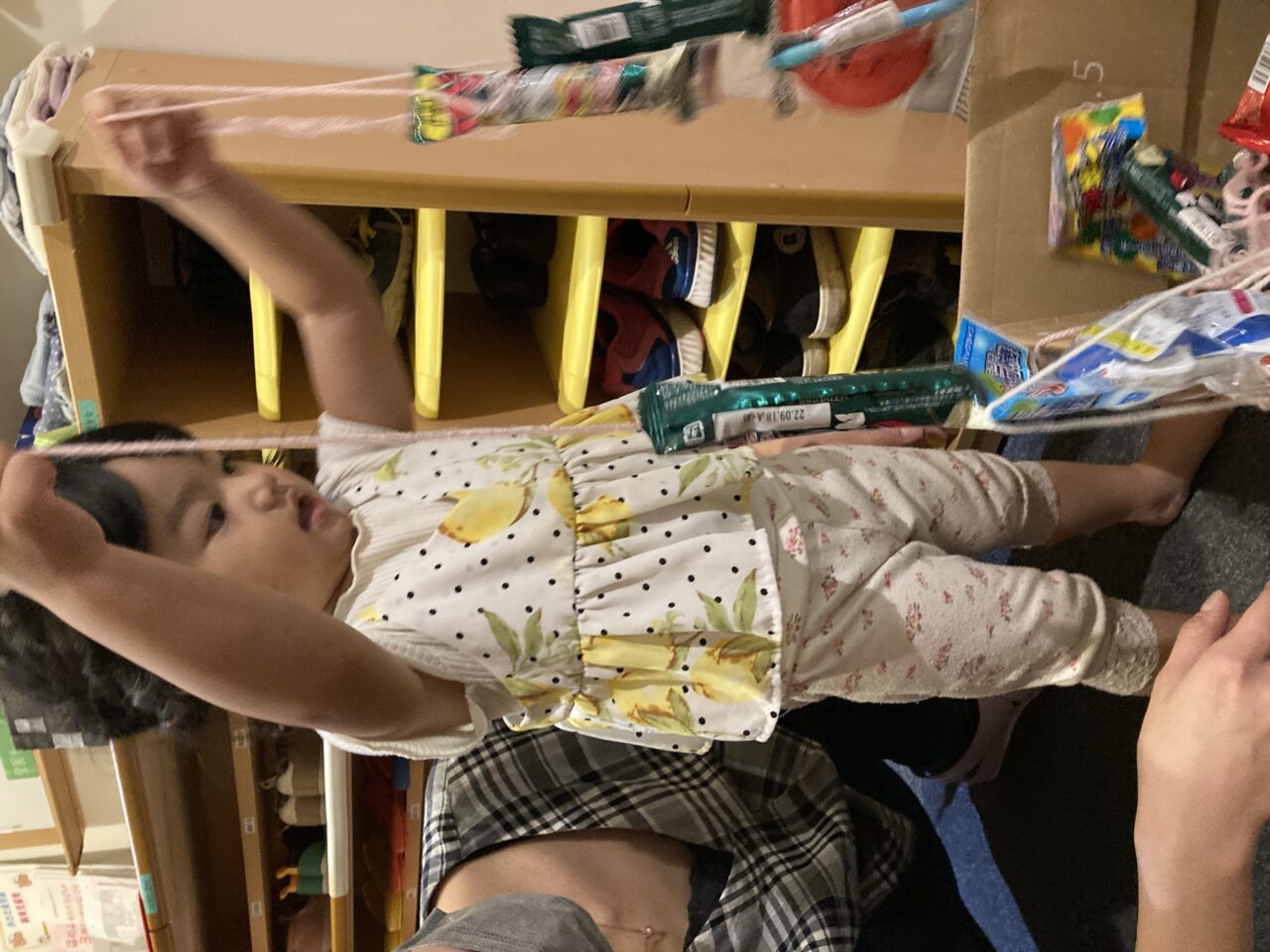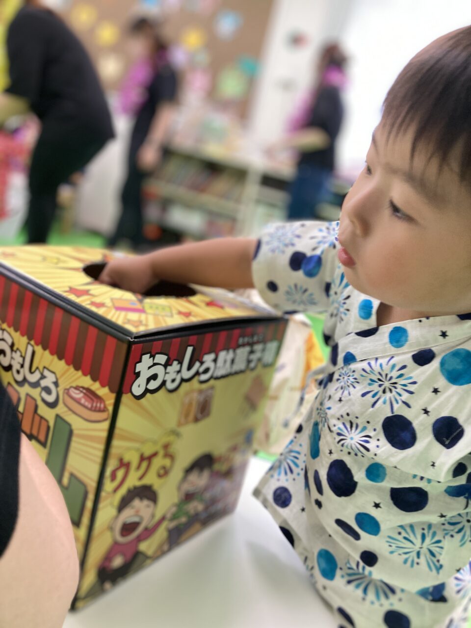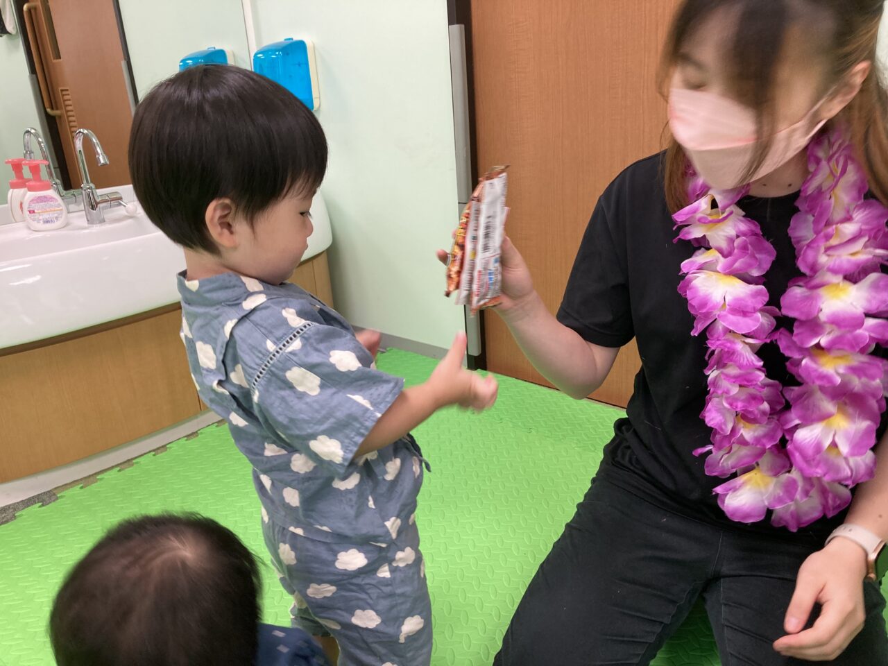 今年度も保護者の方の参加は叶いませんでしたが、お迎えの時に少しでもお祭り気分をと思い、お菓子の紐引きくじをしました〜??✨子ども達も「んーどれにしようかな?」「うあー、すごい?」と喜んでいました。