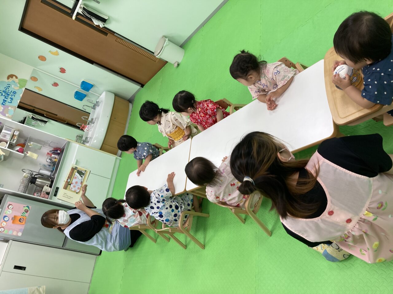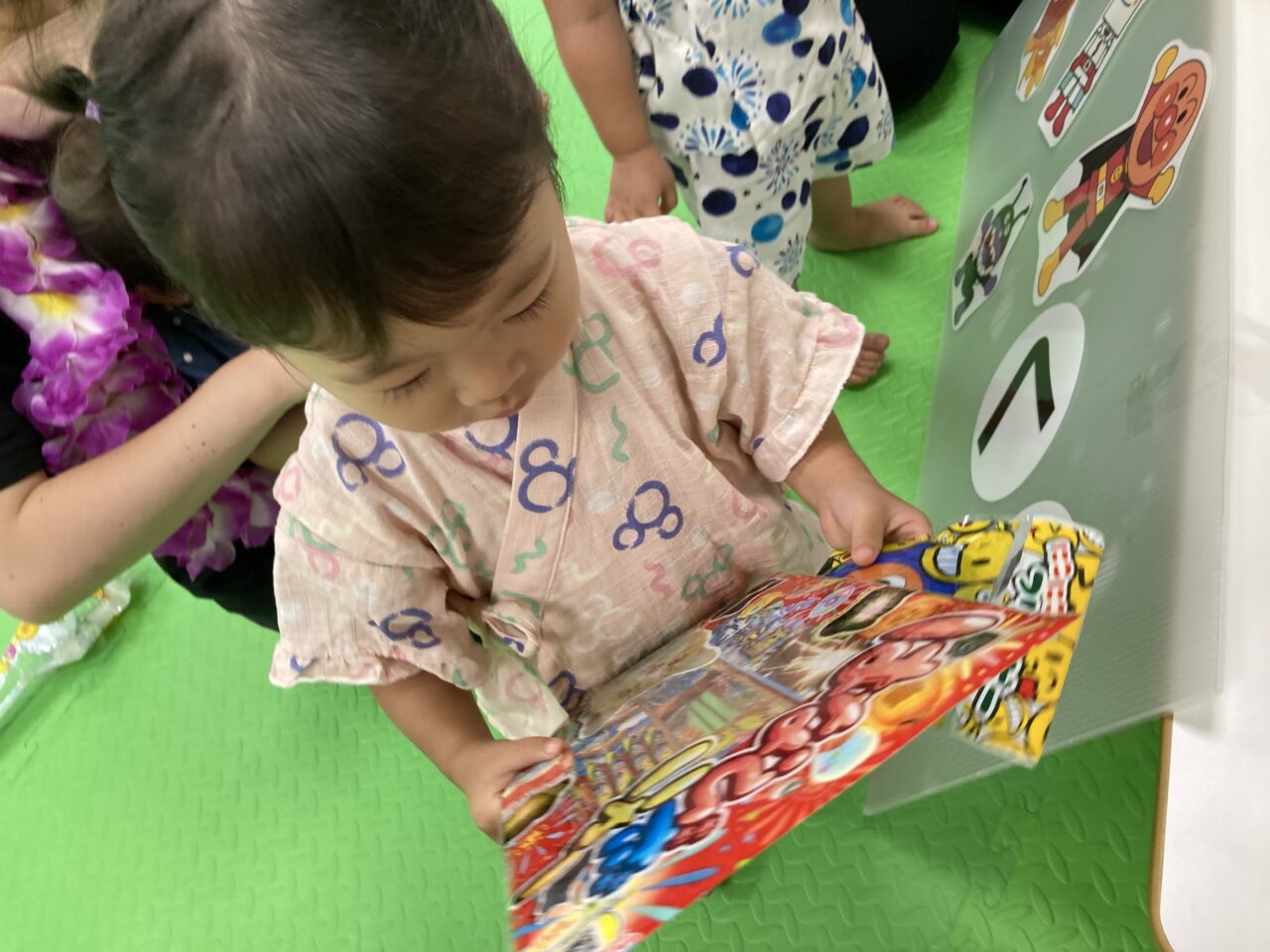 朝の会ではお祭りはどんな事をするのか、子ども達が大好き❤「ワニワニシリーズ?」の絵本を見て伝え、盛り上がっています(笑)?